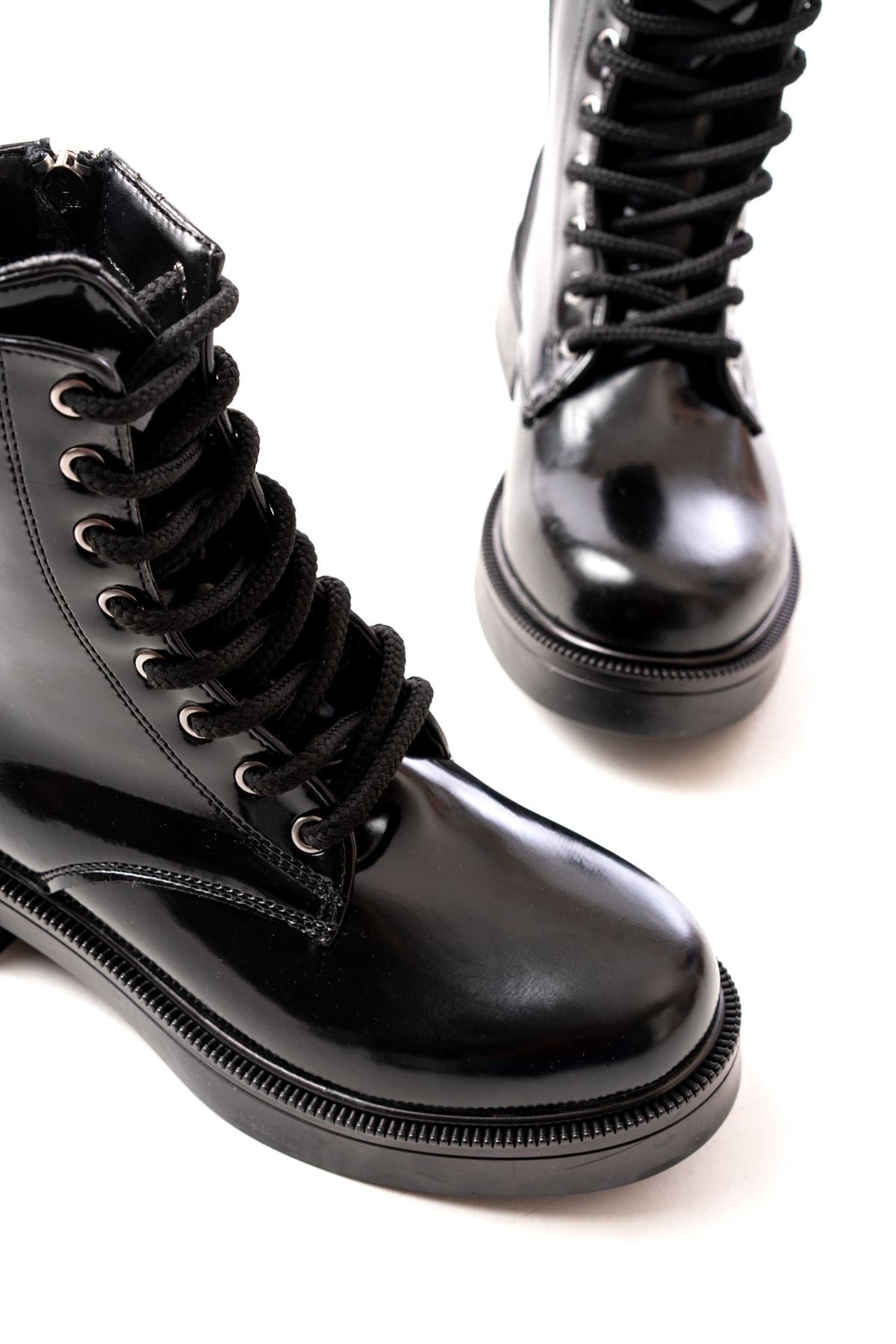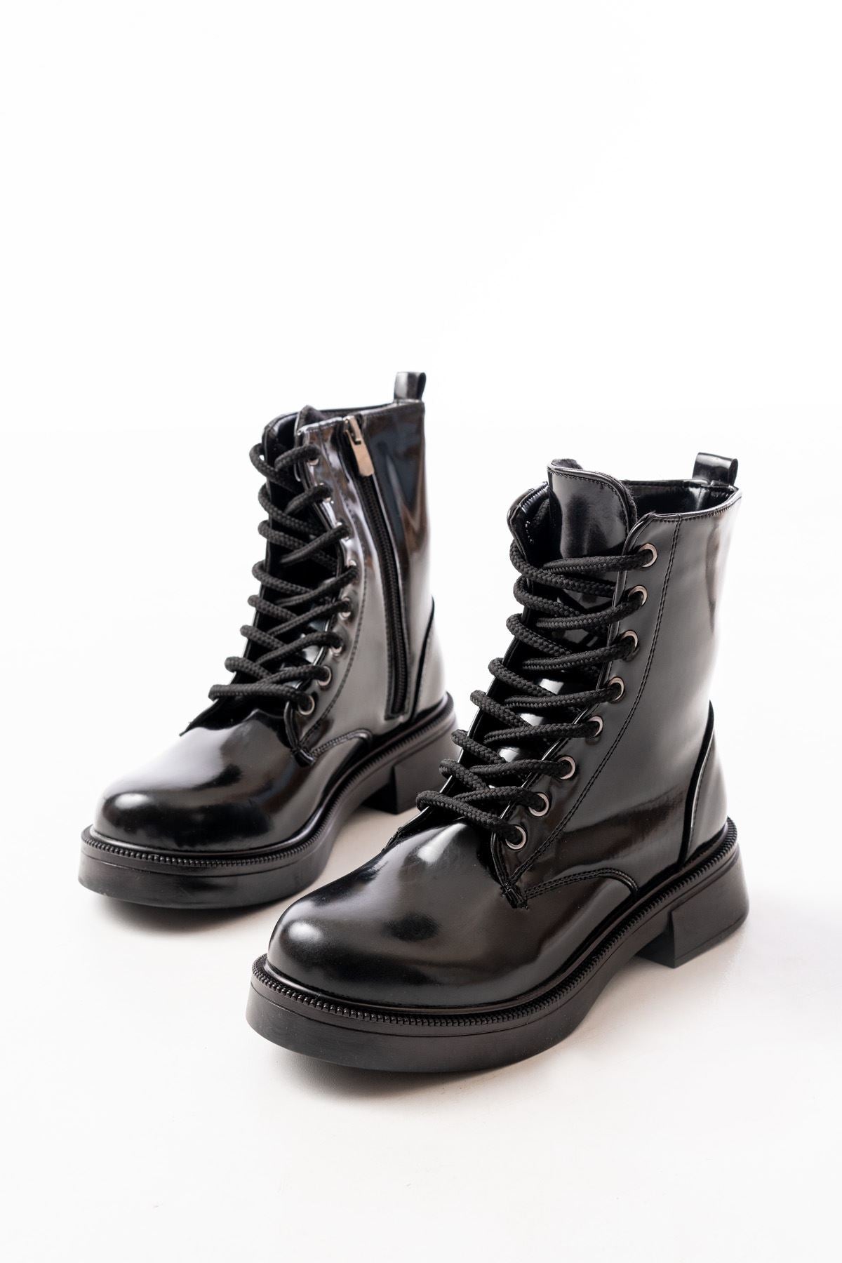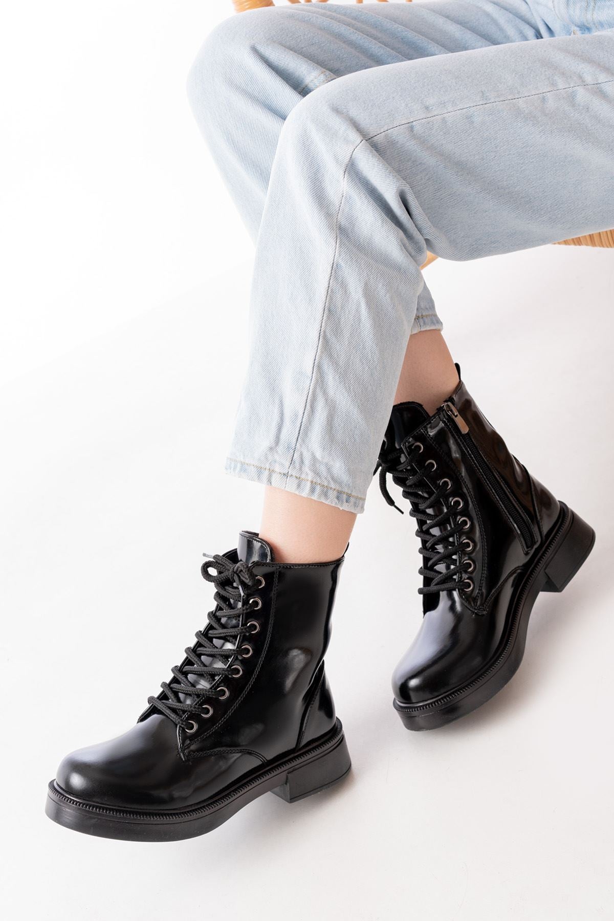 Ayakkabı Aşkı Siyah Rugan Düz Topuklu Bağcıklı Fermuarlı Günlük Kadın Bot