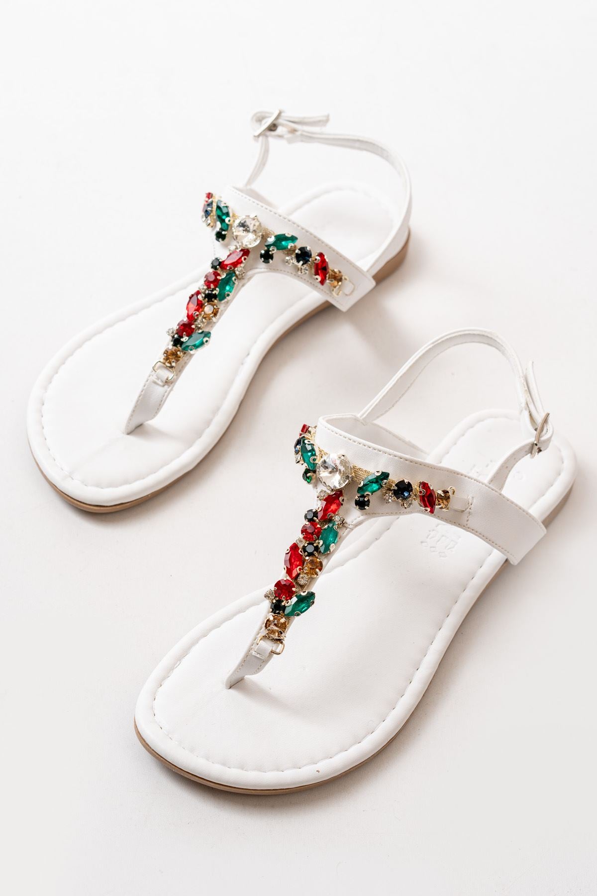 Ayakkabı Aşkı Beyaz Multi Taşlı Parmak Arası Kadın Sandalet