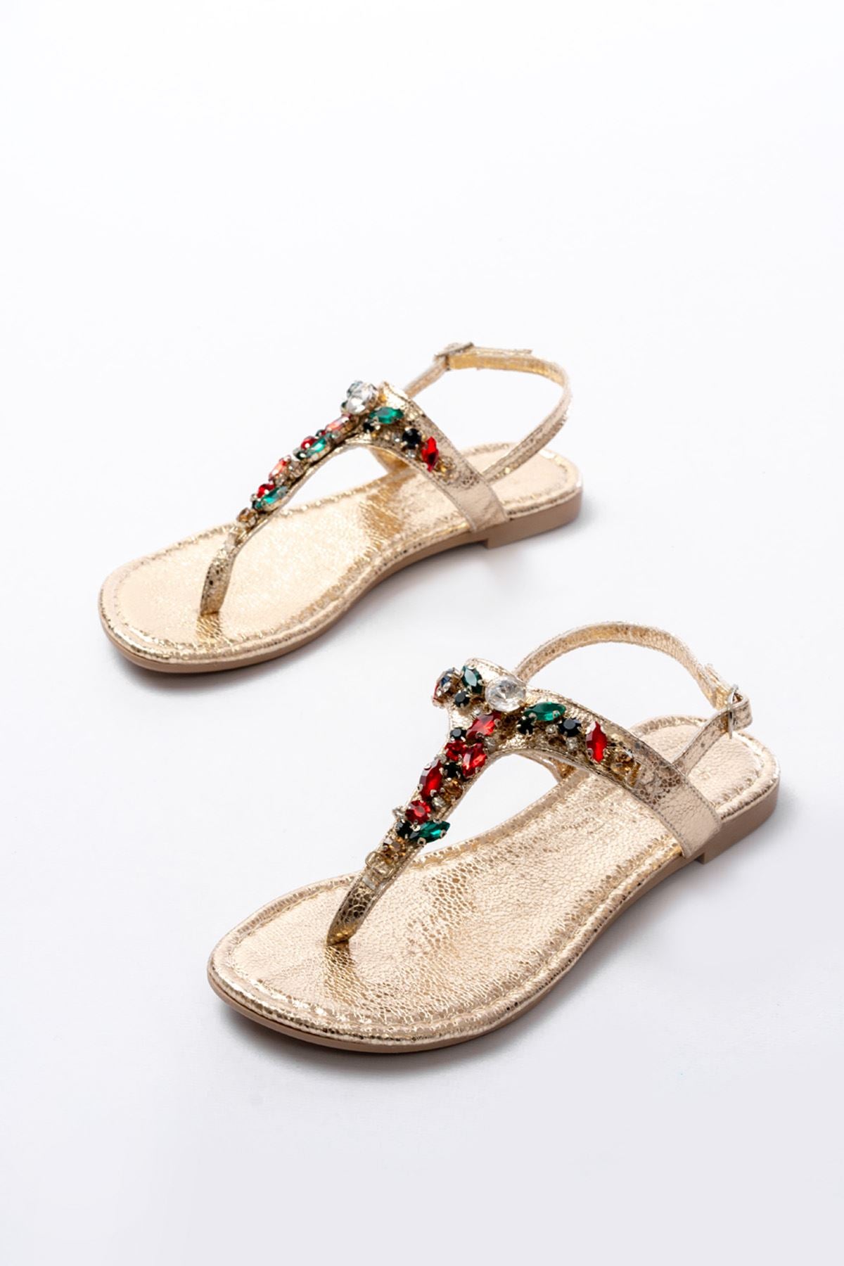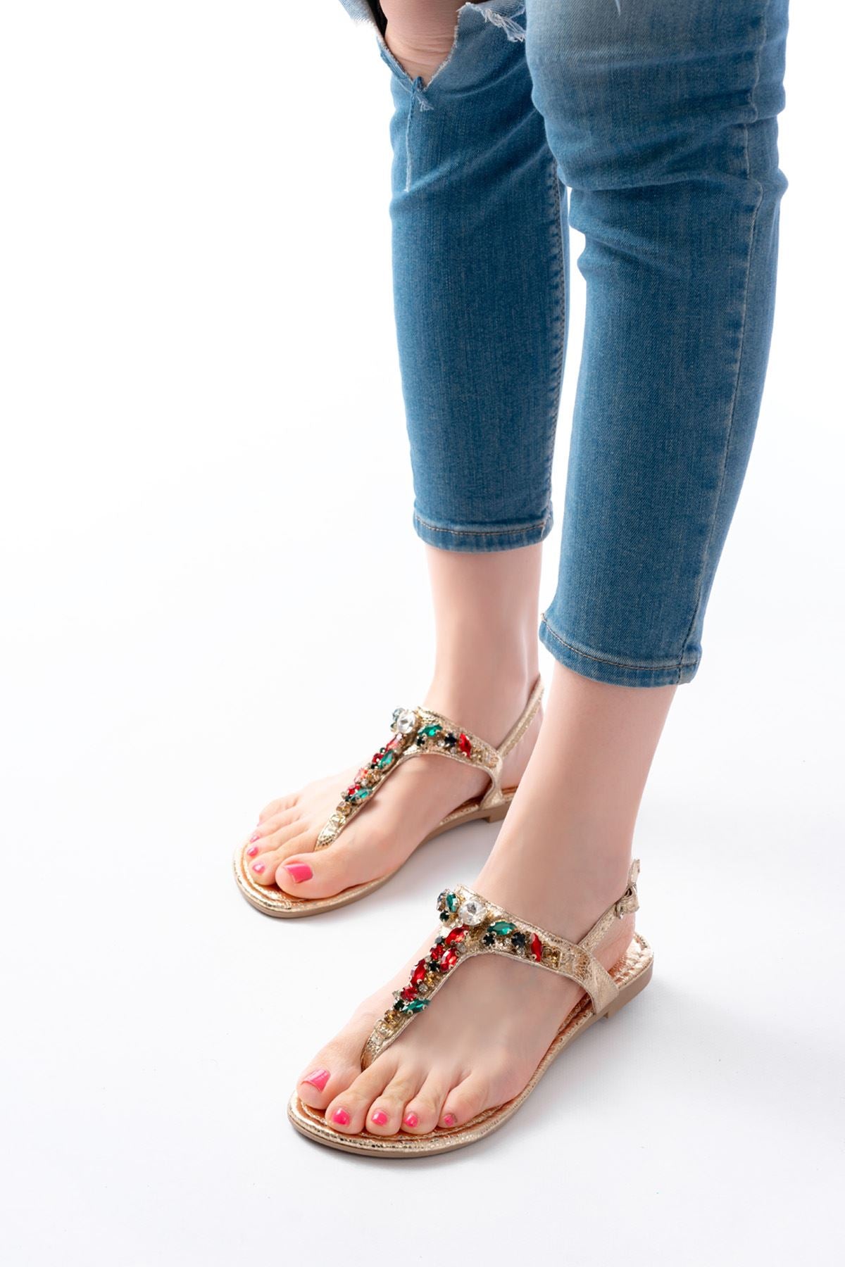 Ayakkabı Aşkı Gold Multi Cam Kırığı Taşlı Parmak Arası Kadın Sandalet