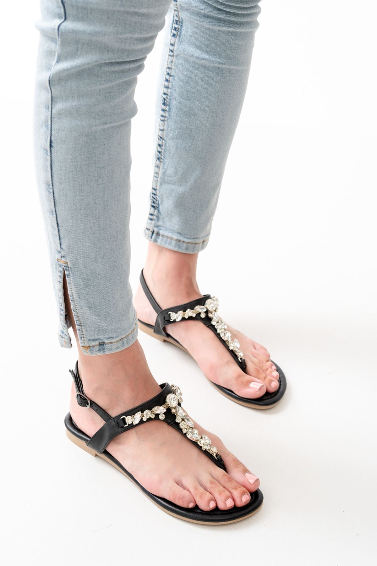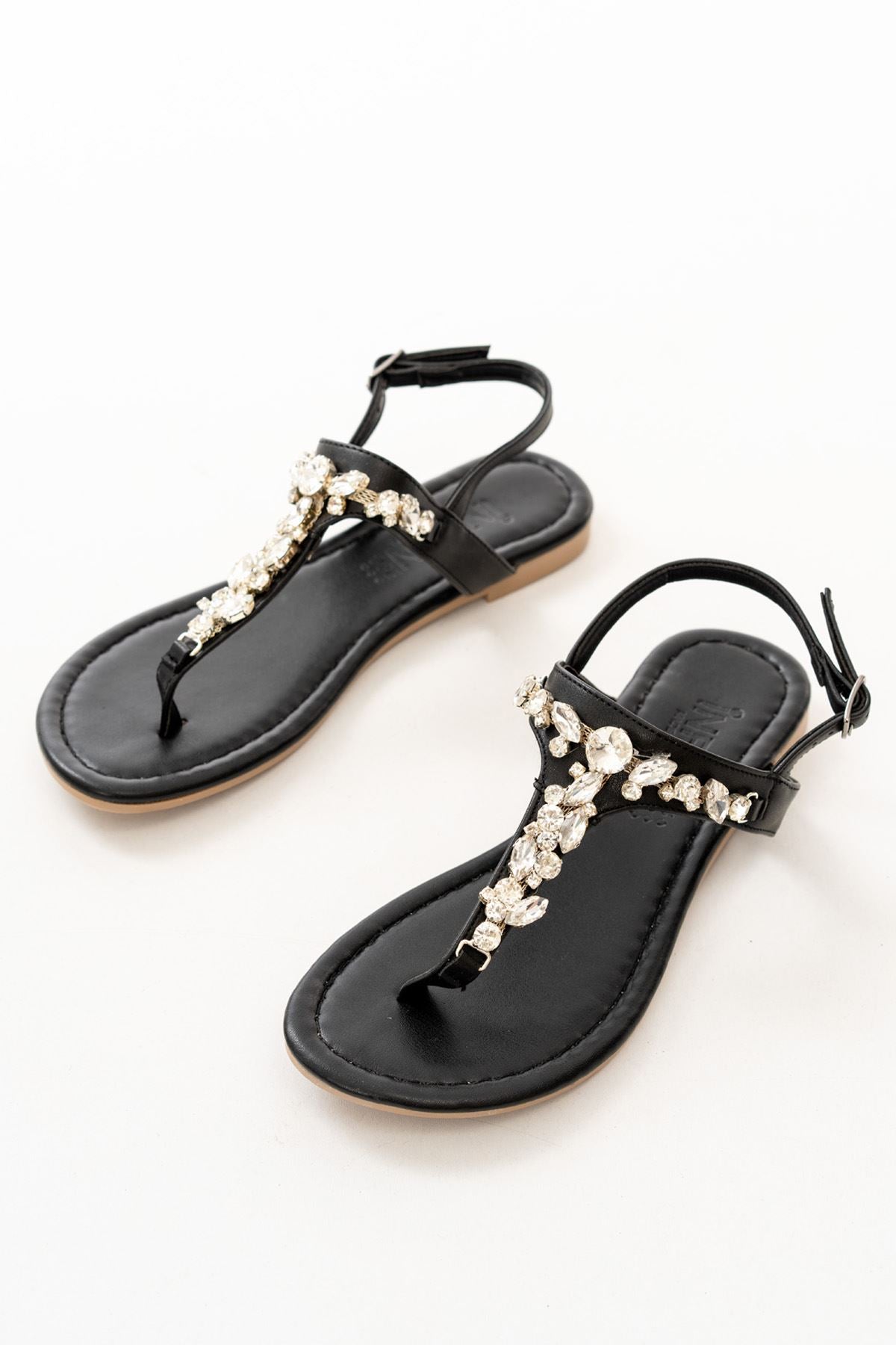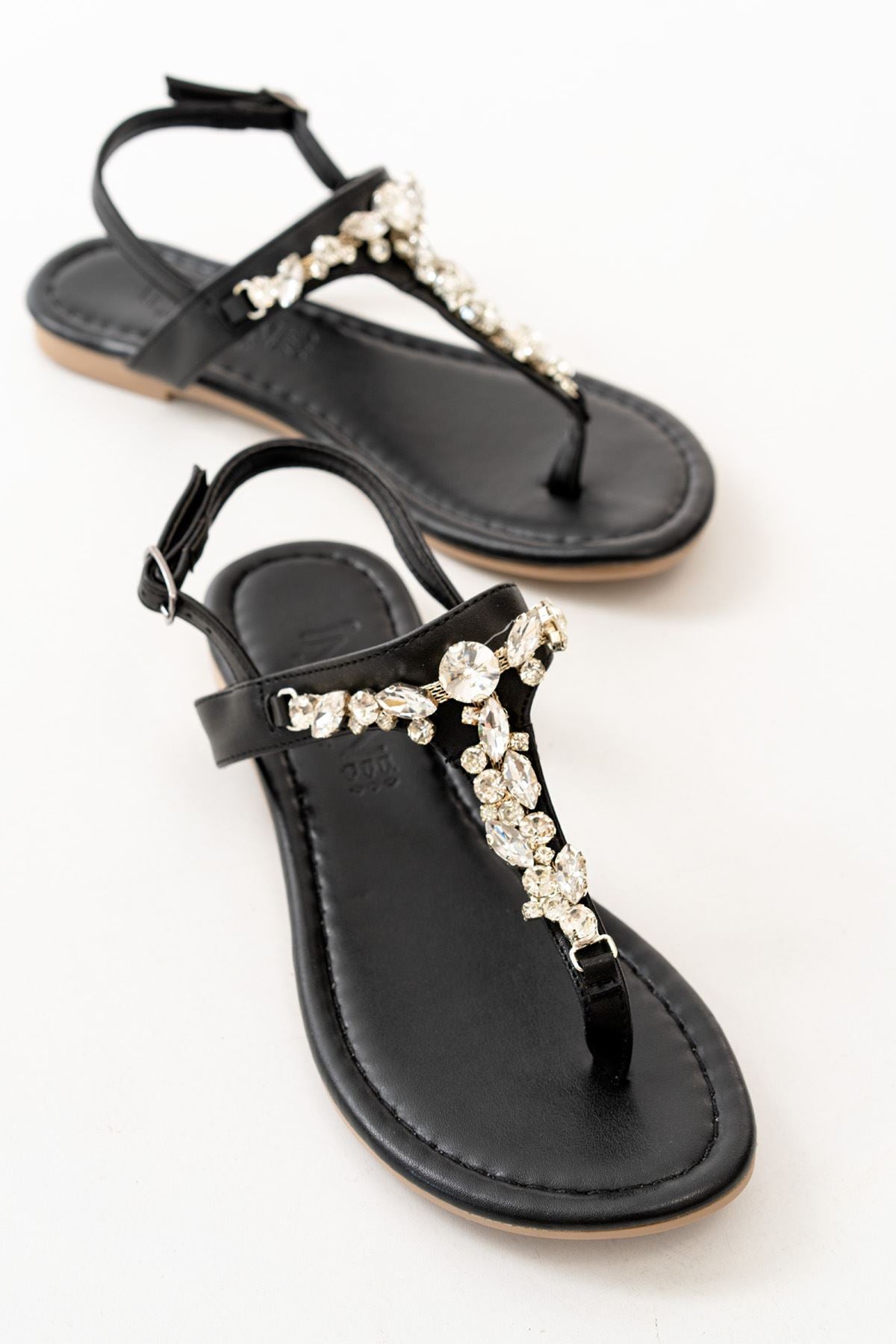 Ayakkabı Aşkı Siyah Gümüş Taşlı Parmak Arası Kadın Sandalet