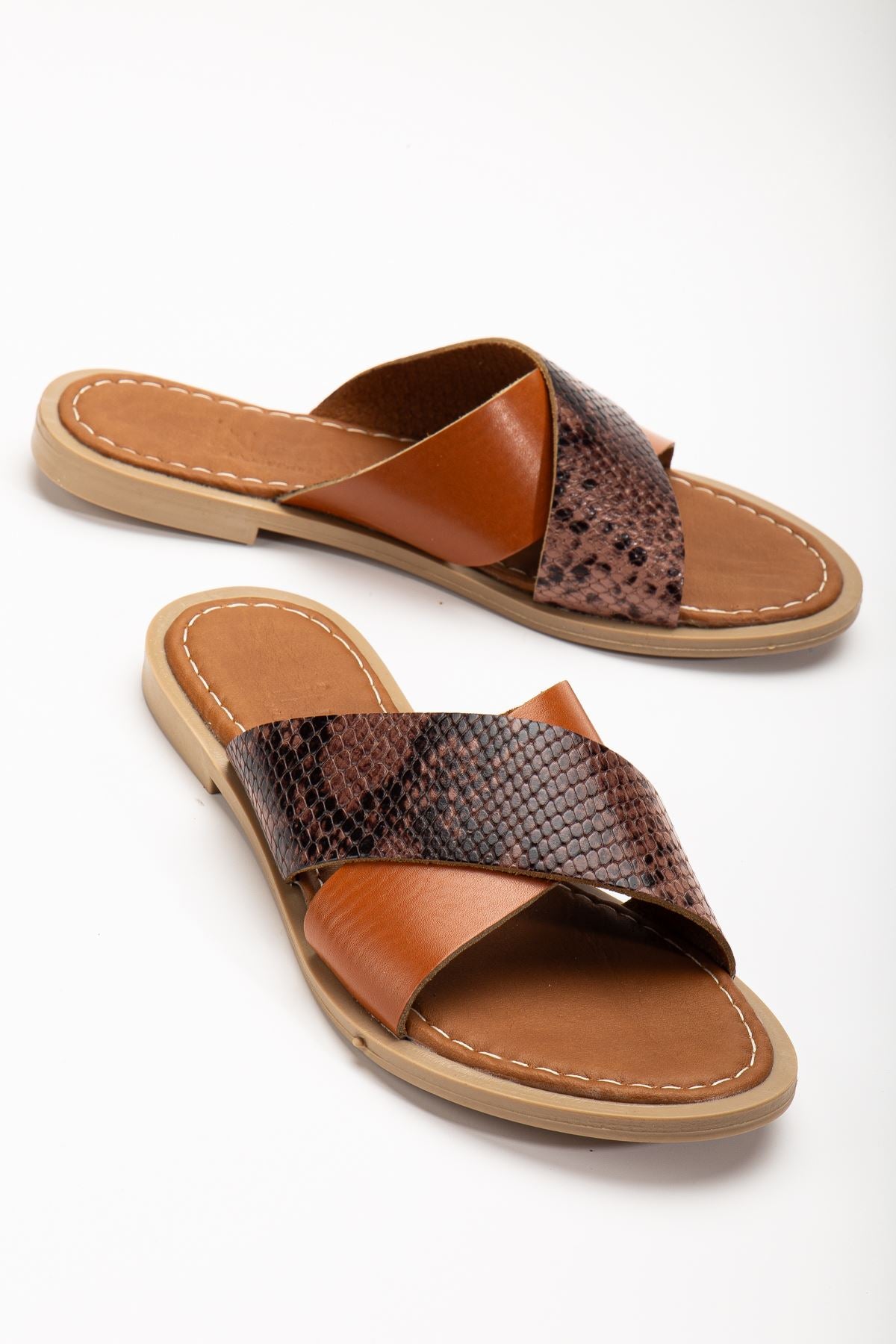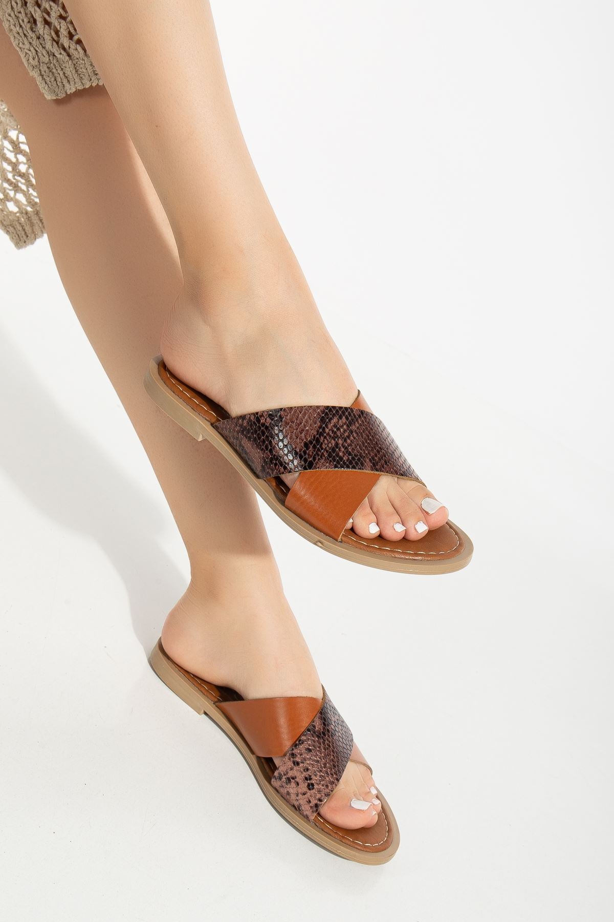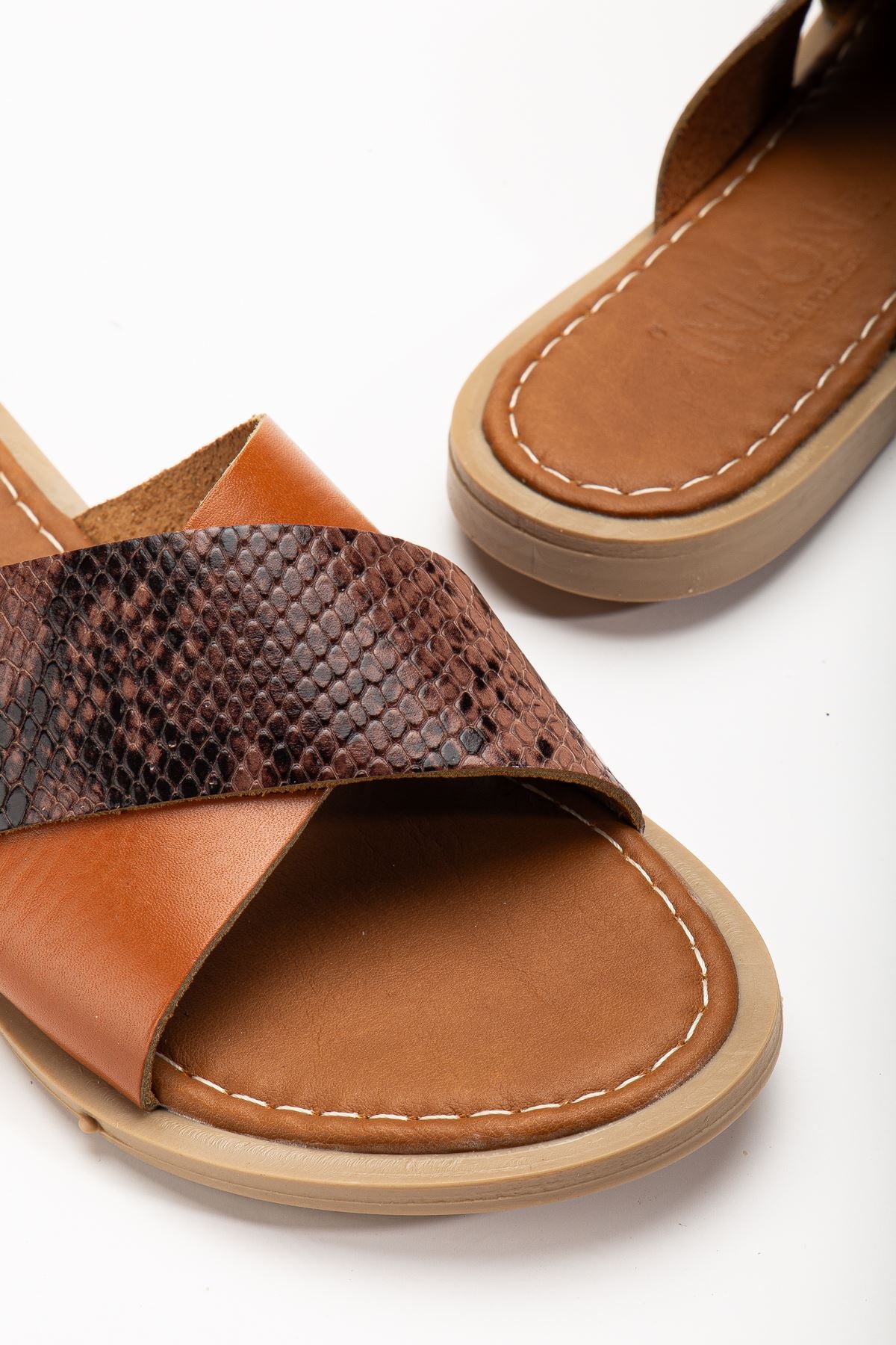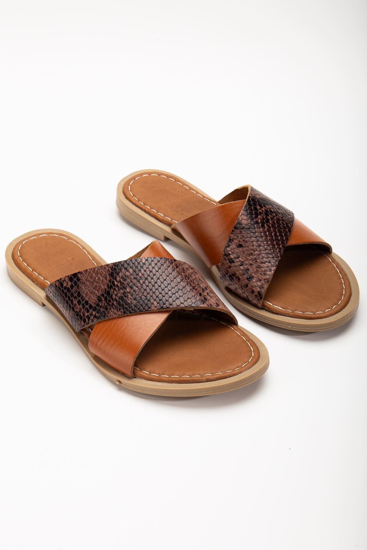 Ayakkabı Aşkı Taba Ortopedik Hakiki Deri Çapraz Bantlı Kadın Terlik