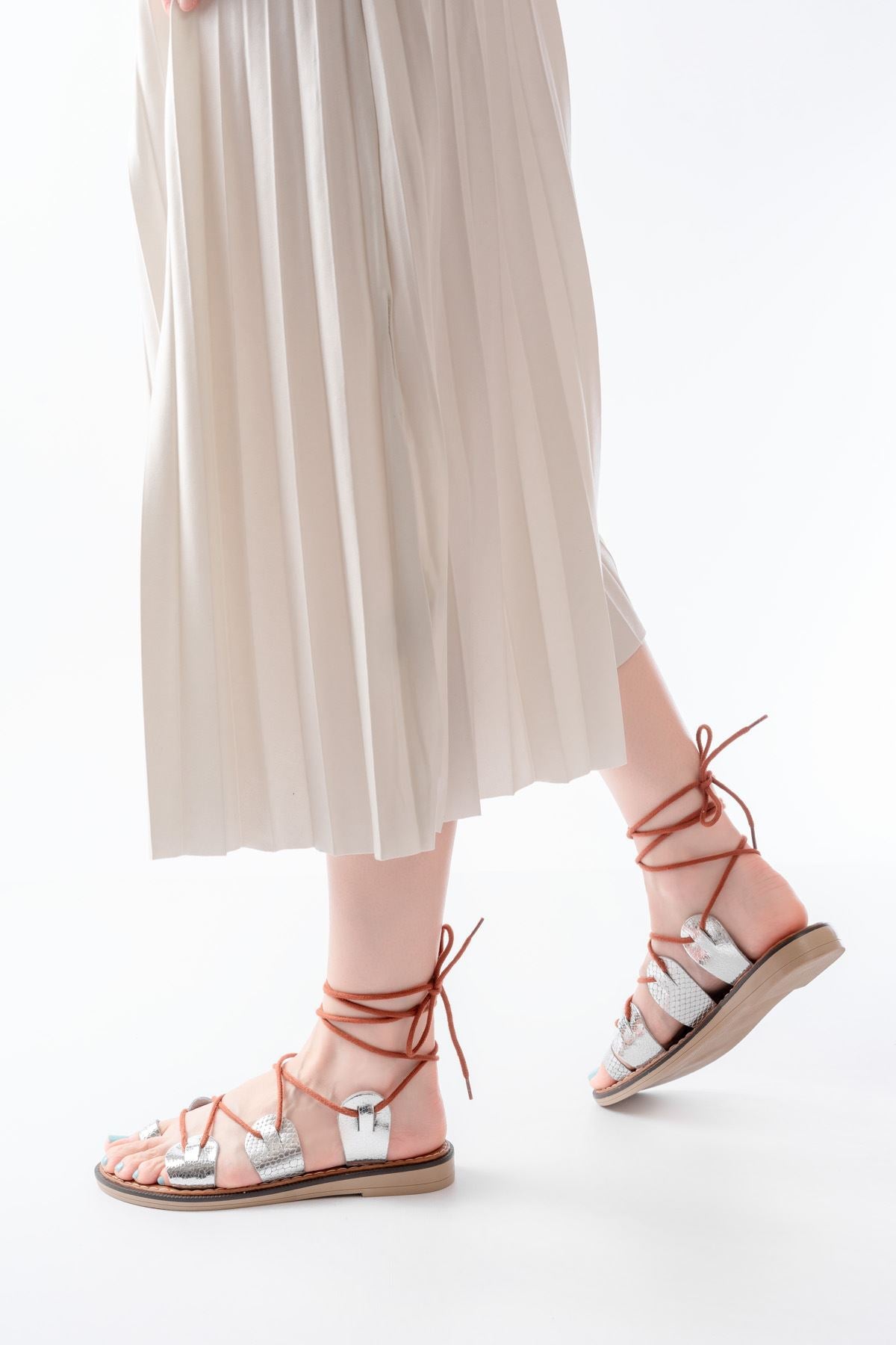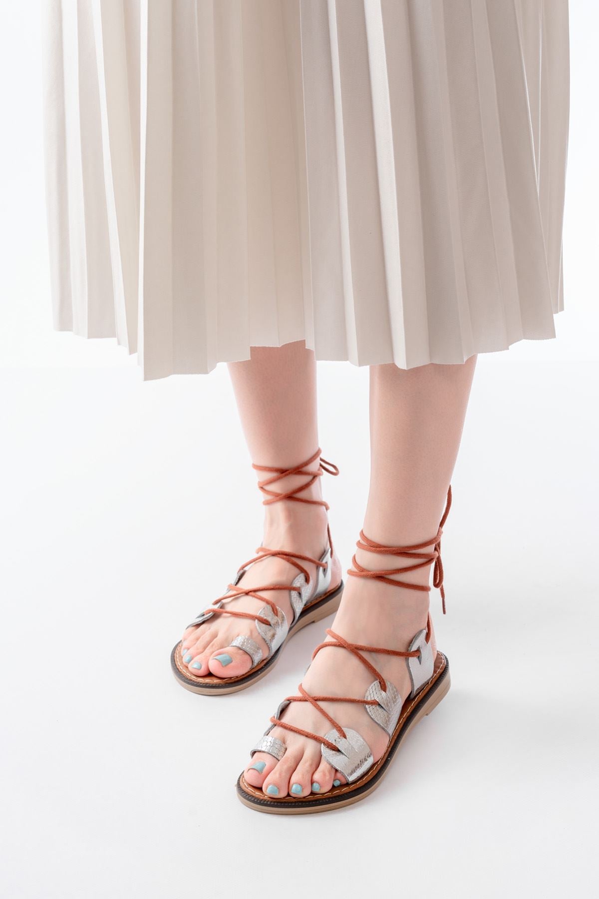 Ayakkabı Aşkı Gümüş Bilekten Bağlamalı Ortopedik Hakiki Deri Kadın Sandalet
