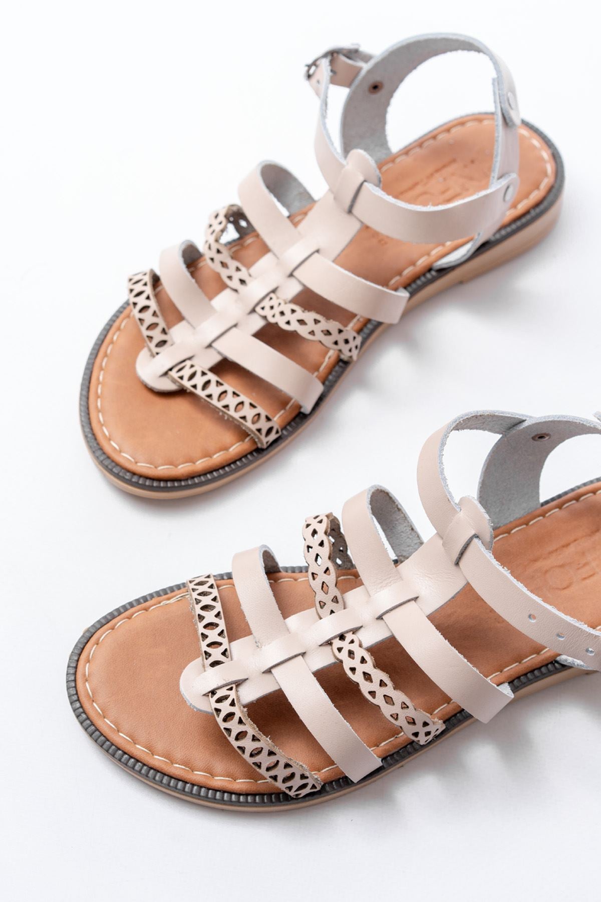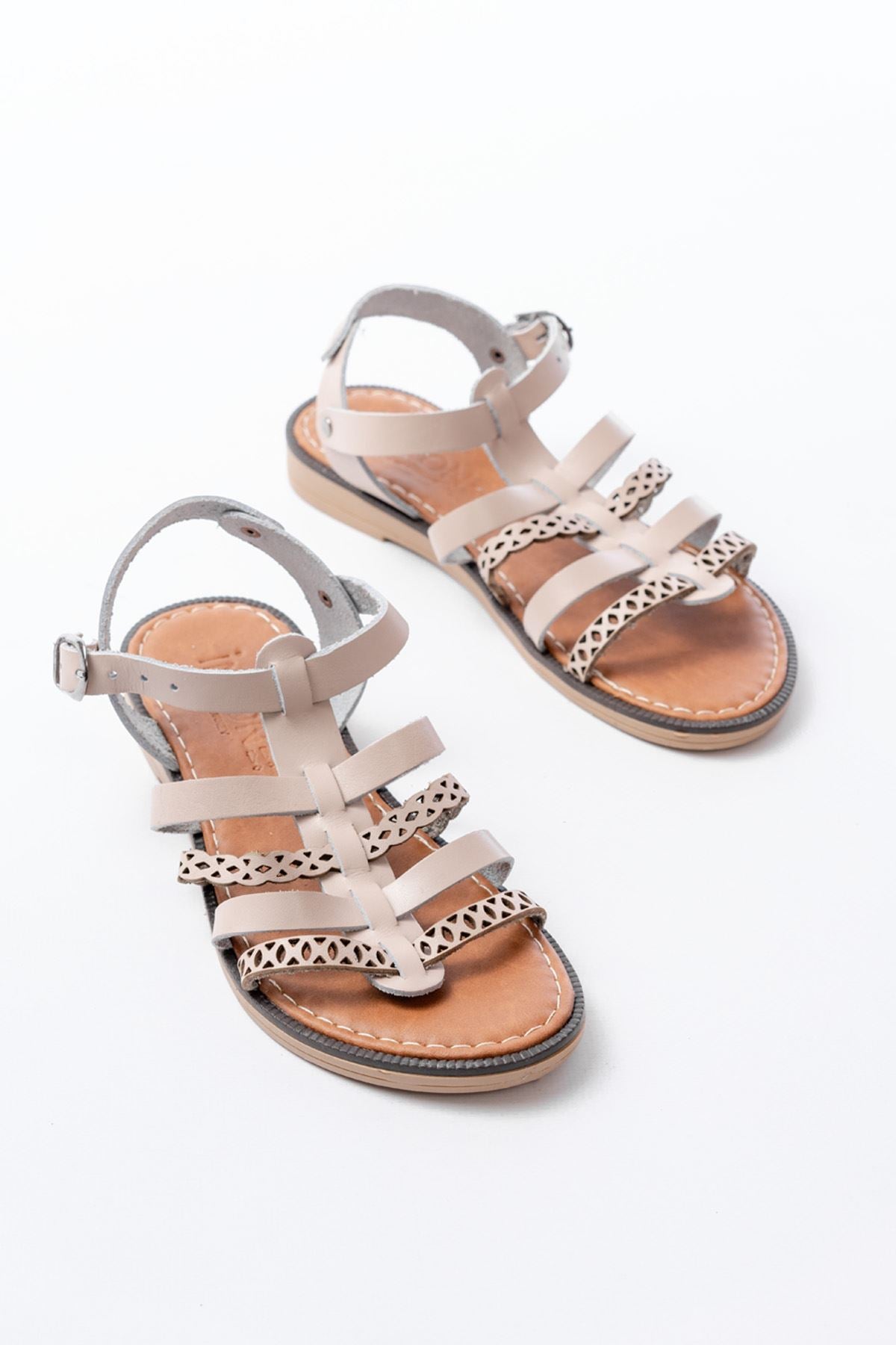 Ayakkabı Aşkı Bej Lazerli Kesim Hakiki Deri Ortopedik Taban Günlük Kadın Sandalet