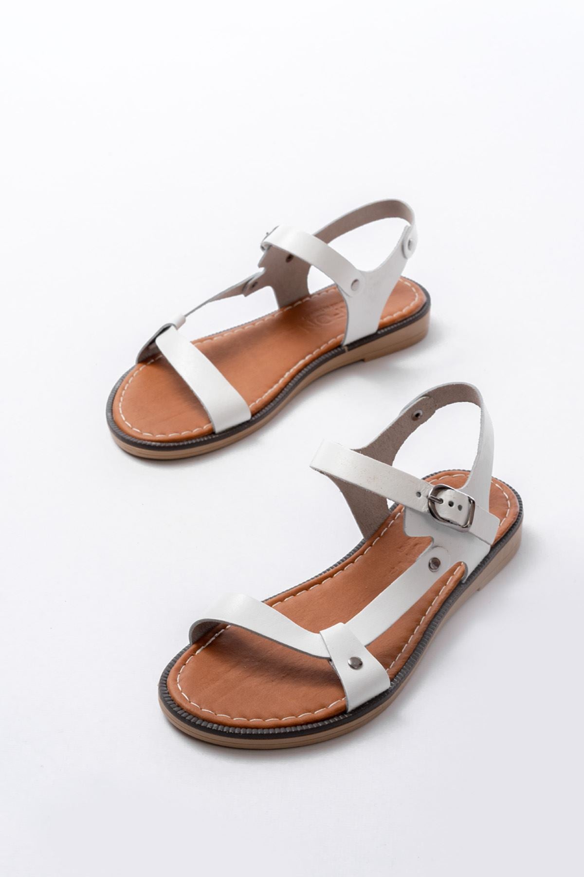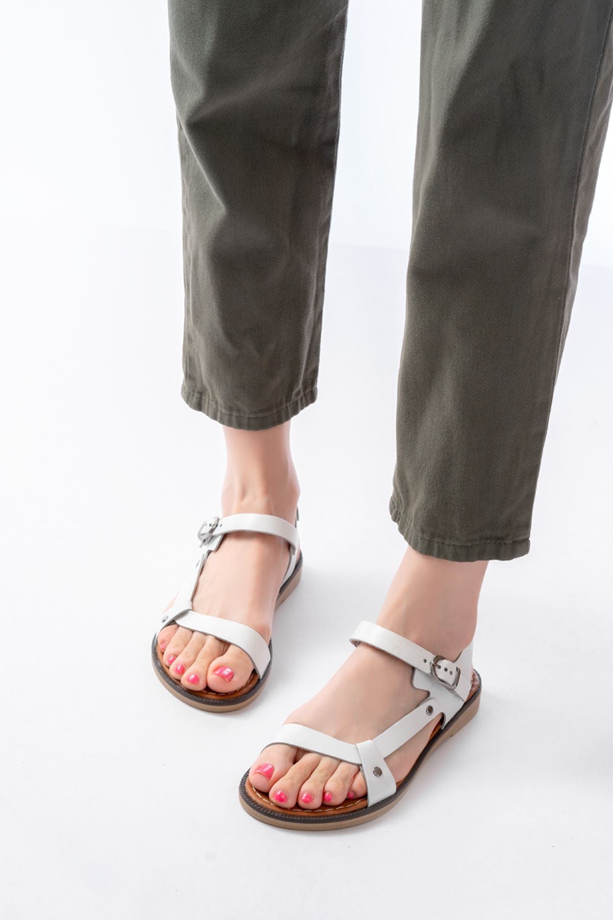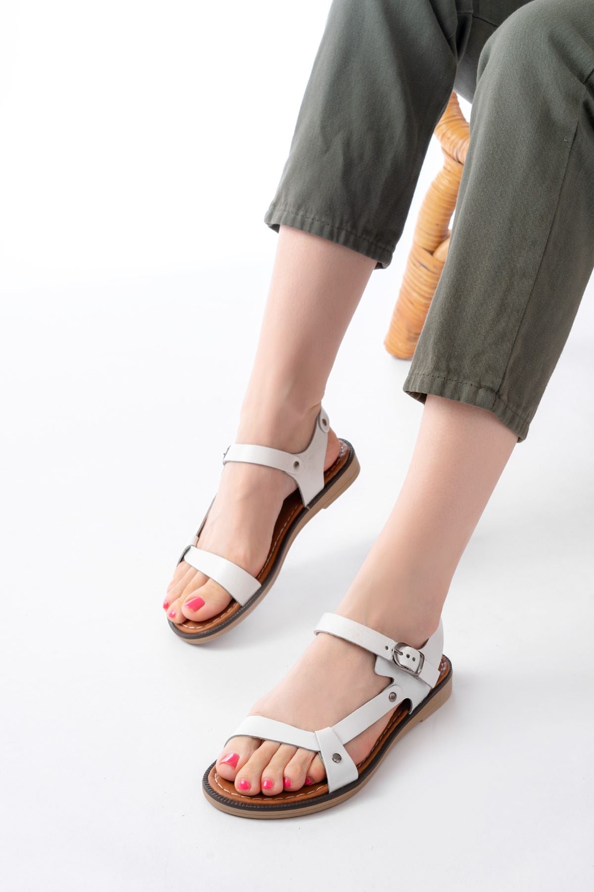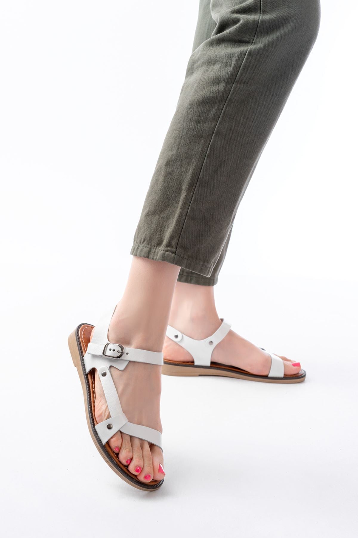 Ayakkabı Aşkı Beyaz Hakiki Deri Tokalı Kadın Sandalet