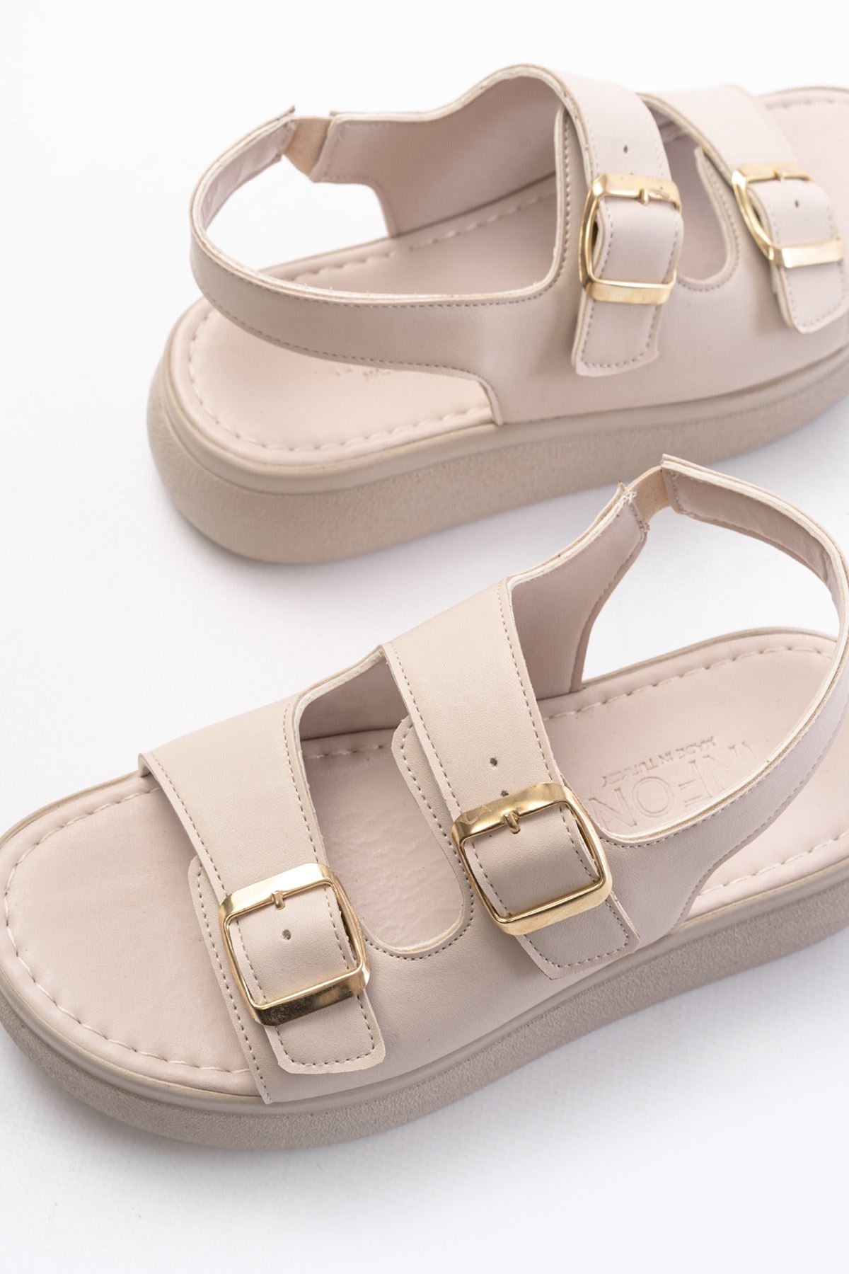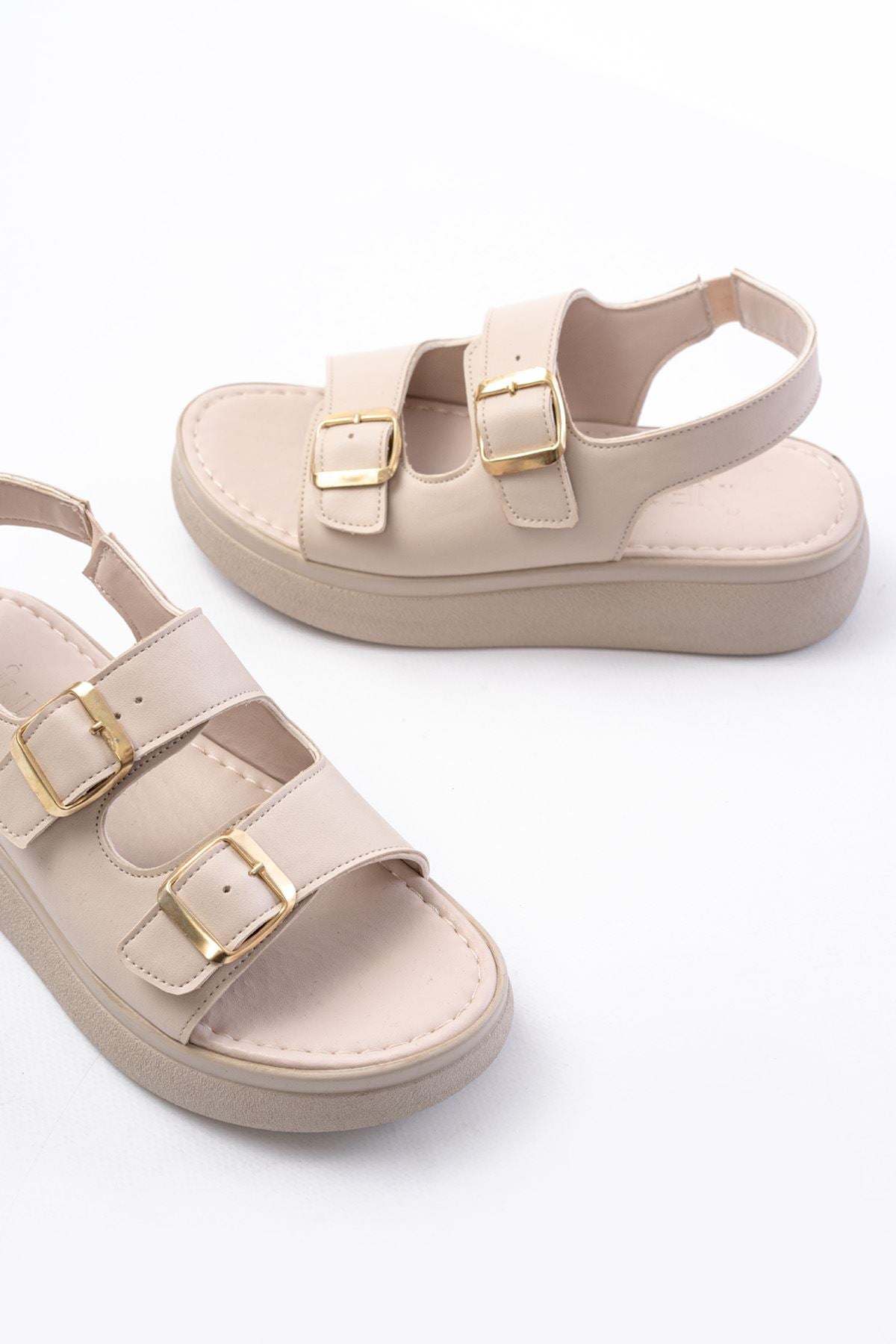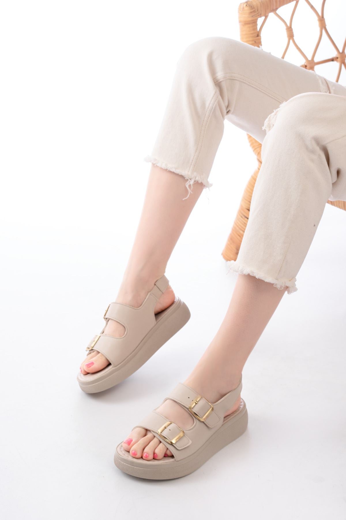 Ayakkabı Aşkı Bej Günlük Dolgu Topuk Toka Aksesuarlı Kadın Sandalet