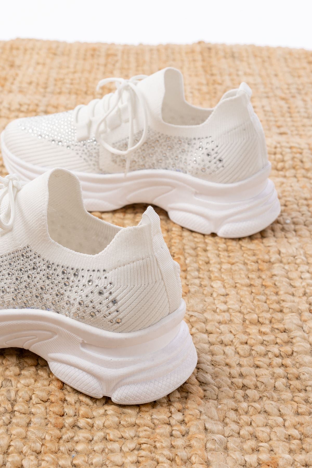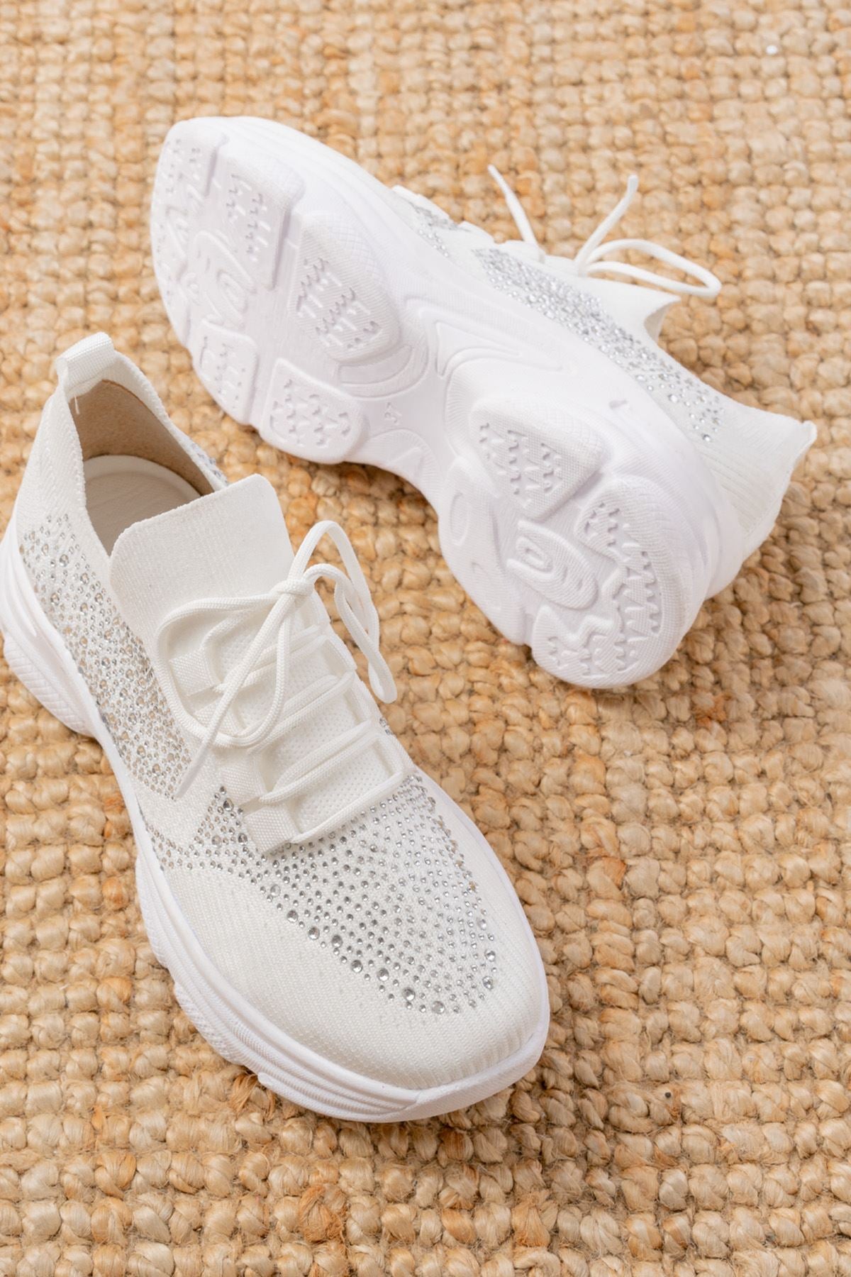 Ayakkabı Aşkı Beyaz Bağcıklı Fileli Taş Aksesuarlı Günlük Spor Ayakkabı