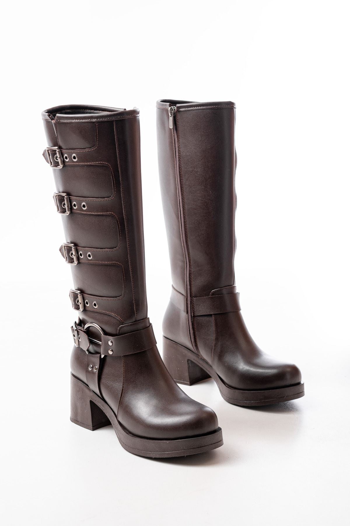 Ayakkabı Aşkı Kahverengi Topuklu Fermuarlı Toka Aksesuarlı Günlük Kadın Çizme