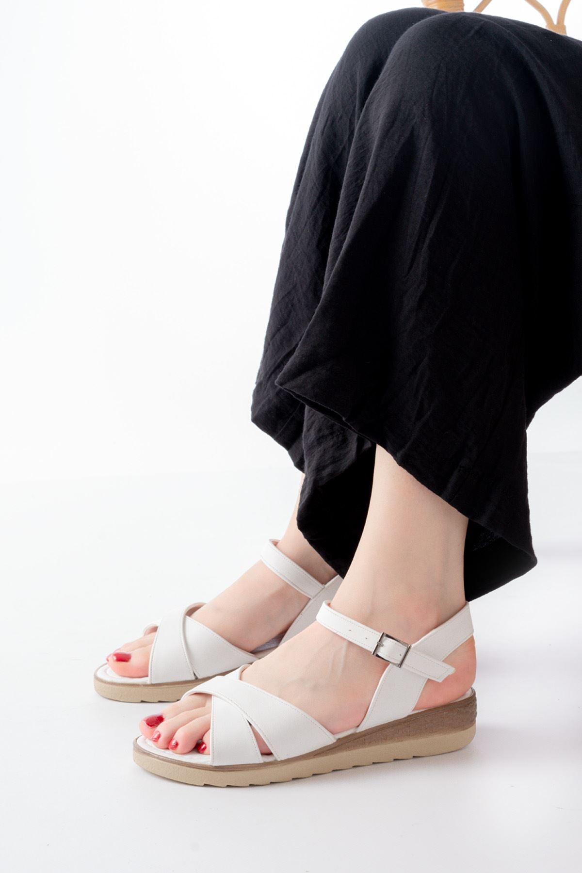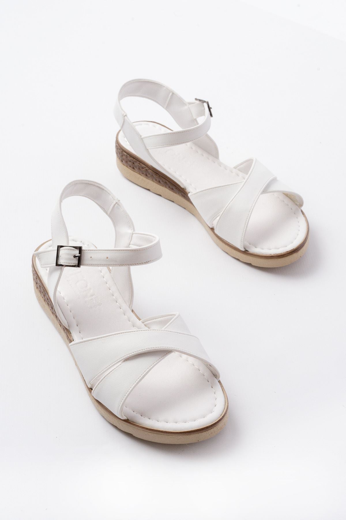 Ayakkabı Aşkı Beyaz Ortopedik Taban Çapraz Tokalı Kadın Sandalet