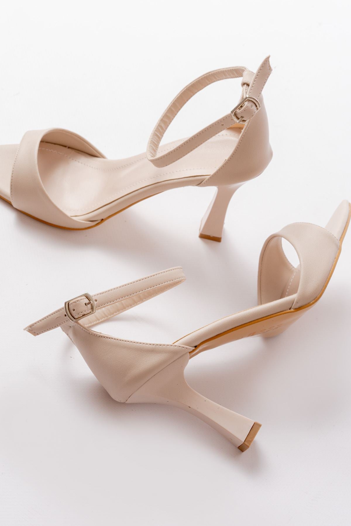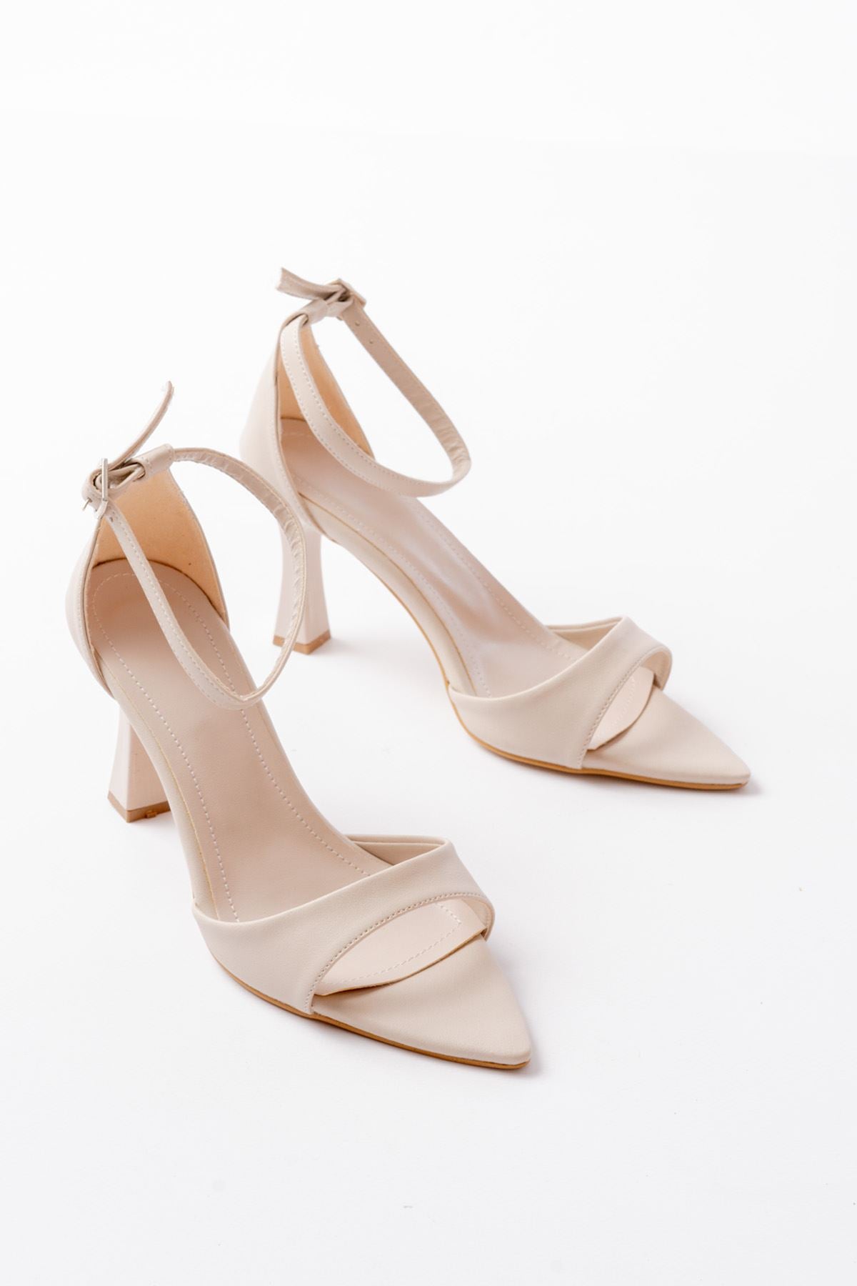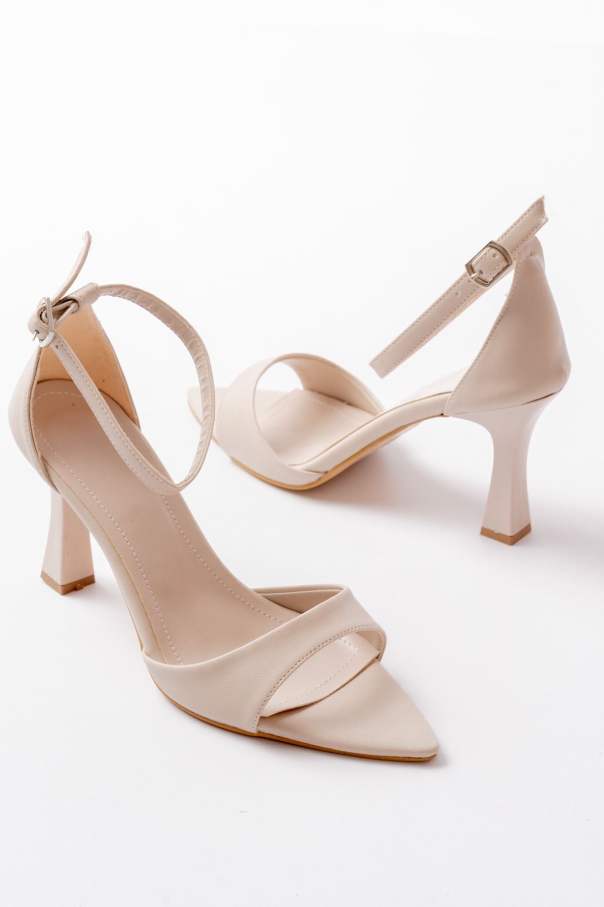Ayakkabı Aşkı 718 Bej Cilt Sivri Burunlu Topuklu Bilekten Bağlamalı Kadın Ayakkabı