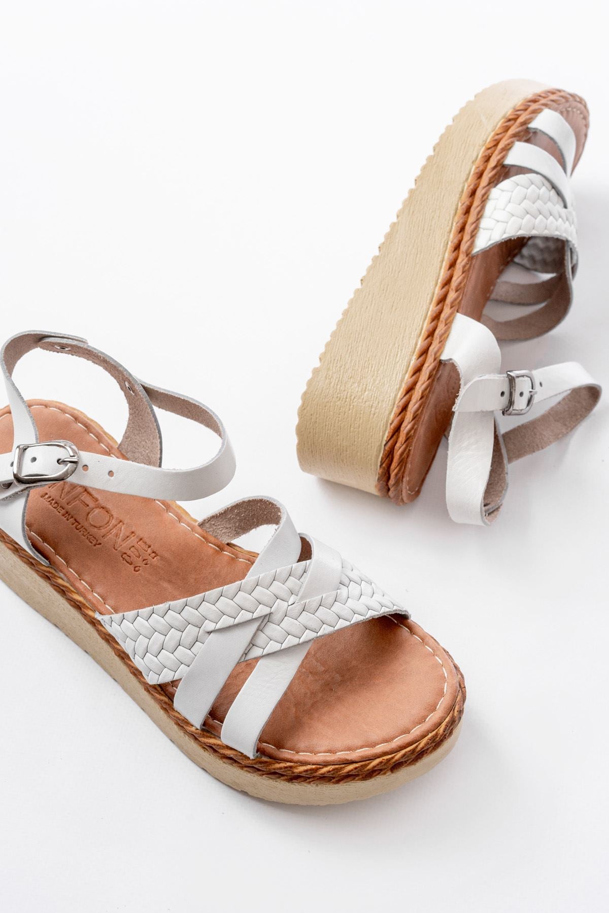 Ayakkabı Aşkı Beyaz Örgü Hakiki Deri Ortopedik Taban Kadın Sandalet