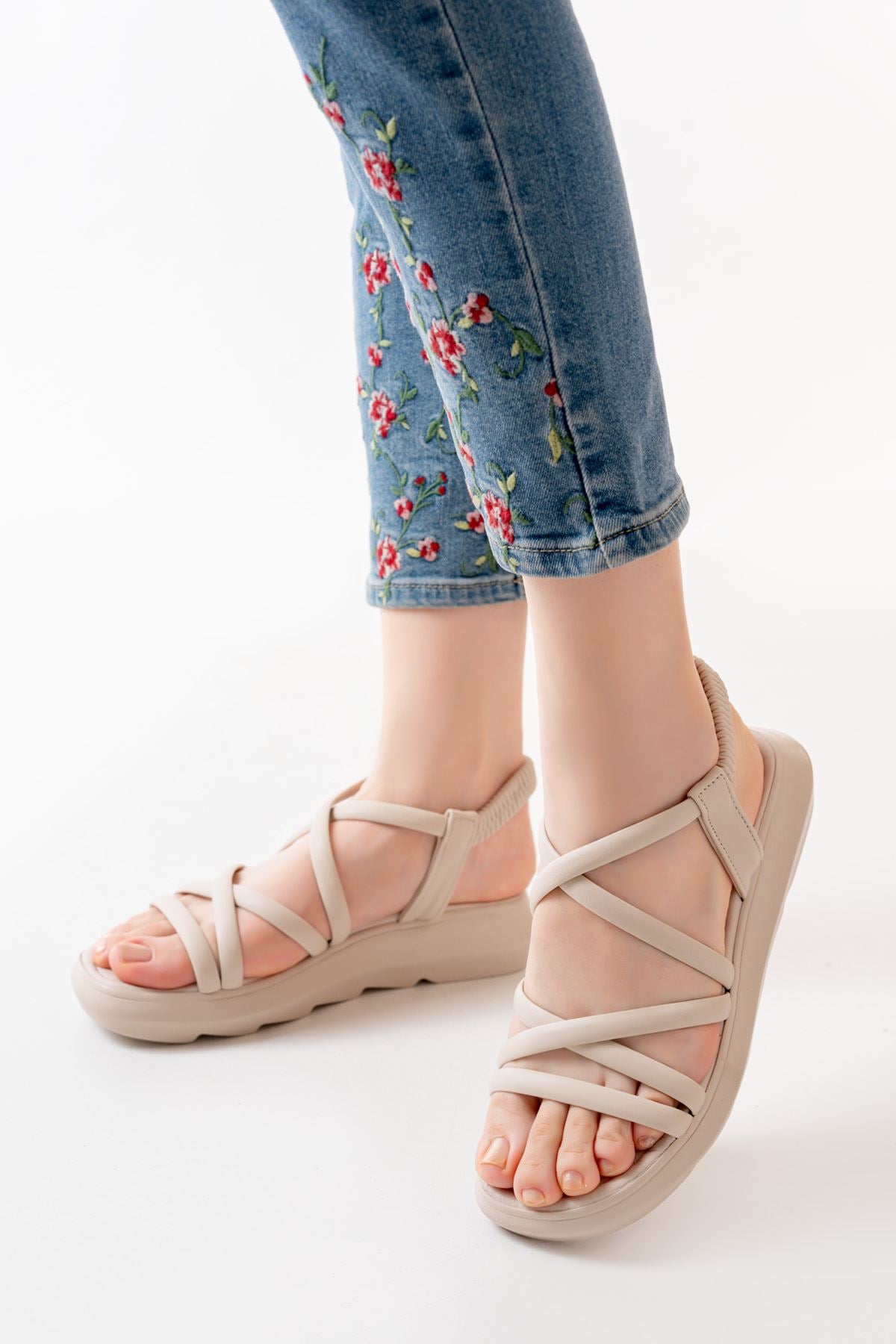 Ayakkabı Aşkı Bej Lastikli Kadın Günlük Sandalet