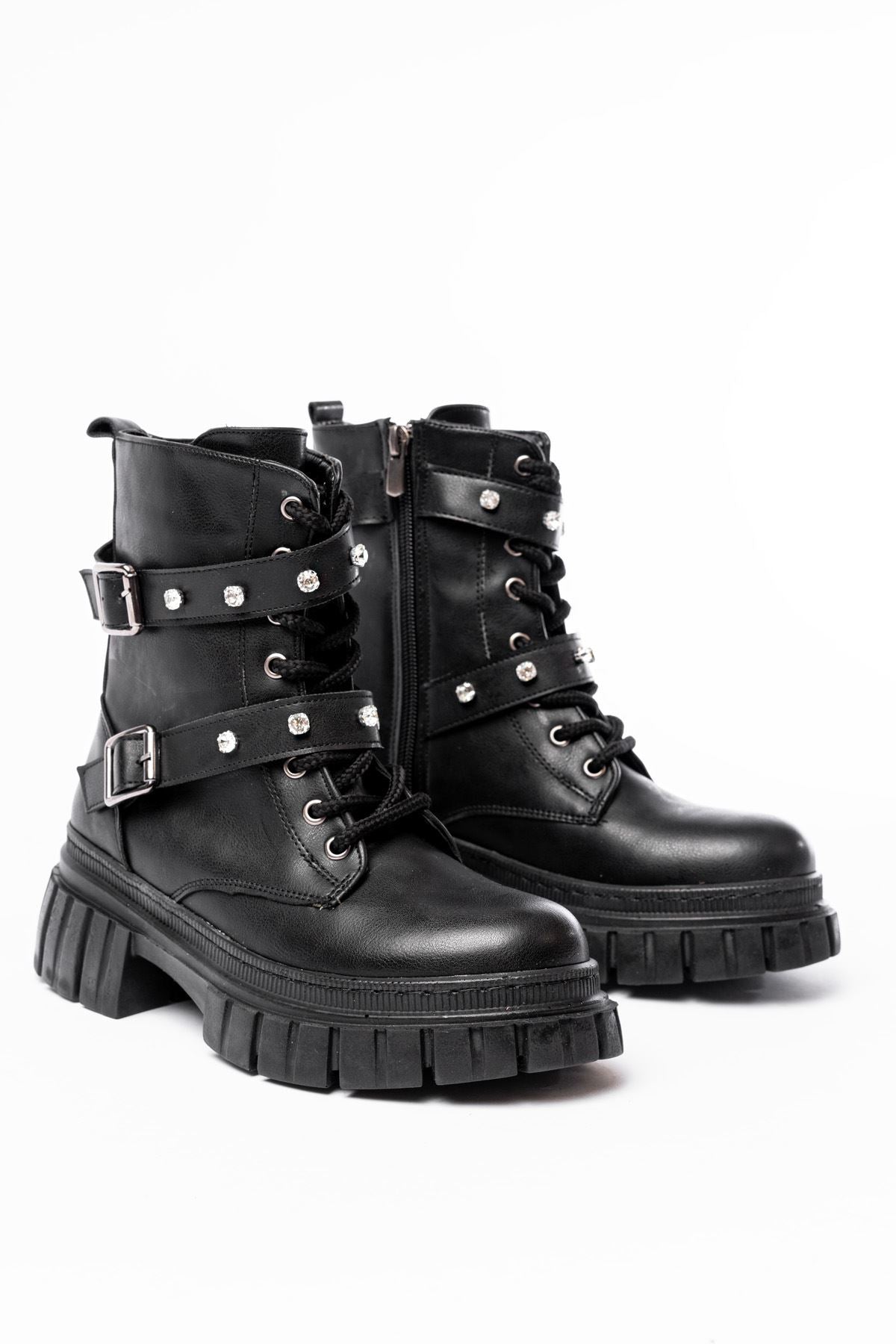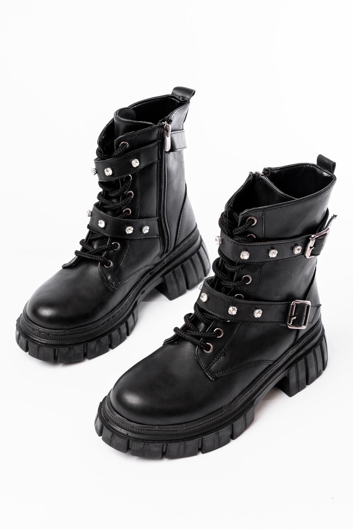 Ayakkabı Aşkı Siyah Bağcıklı Kalın Tabanlı Bağcıklı Fermuarlı Günlük Kadın Bot