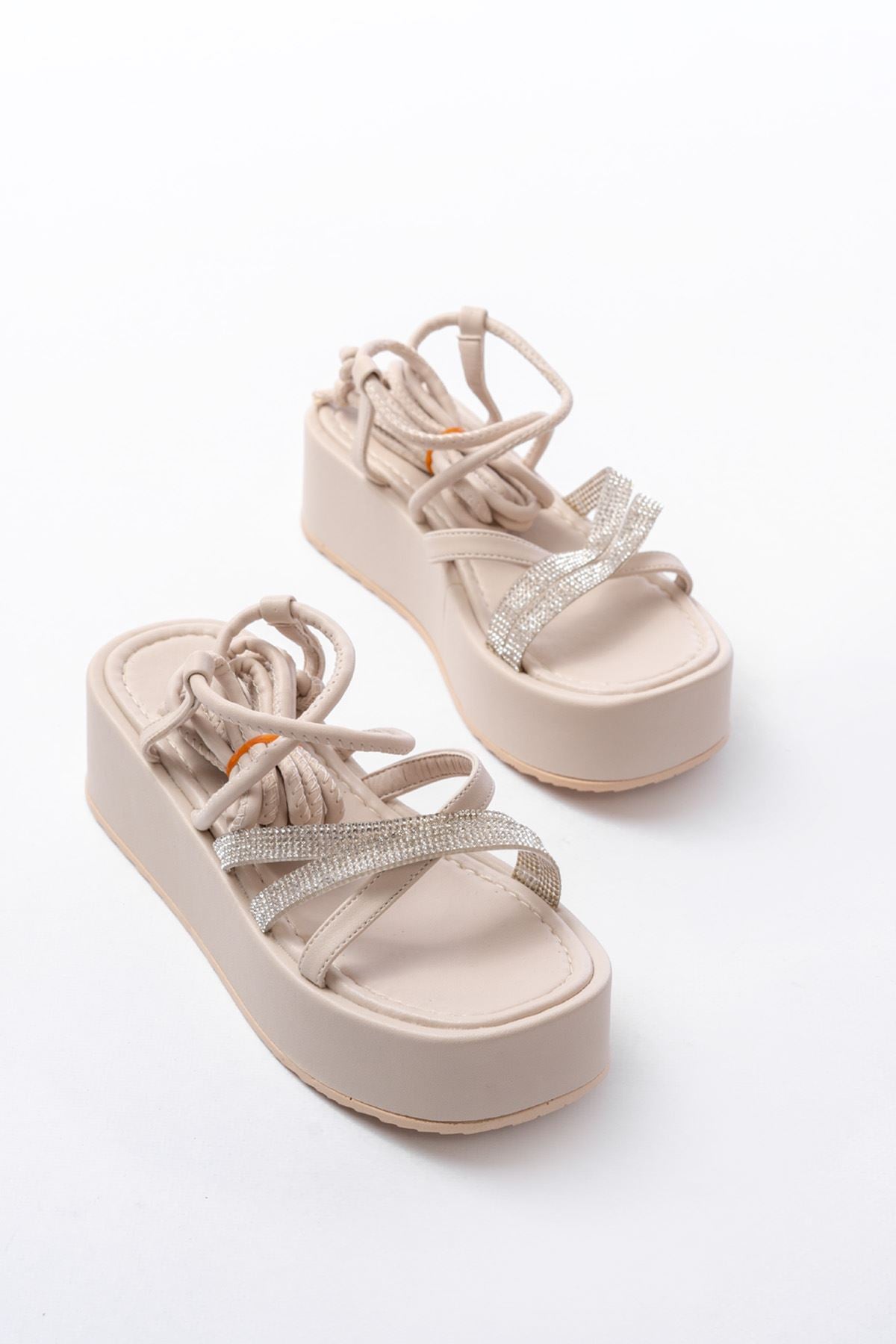 Ayakkabı Aşkı Bej Gümüş Taşlı Bilekten Bağlamalı Kadın Sandalet