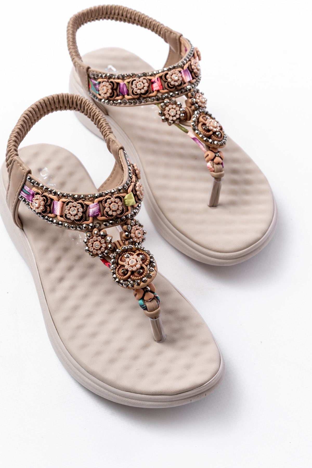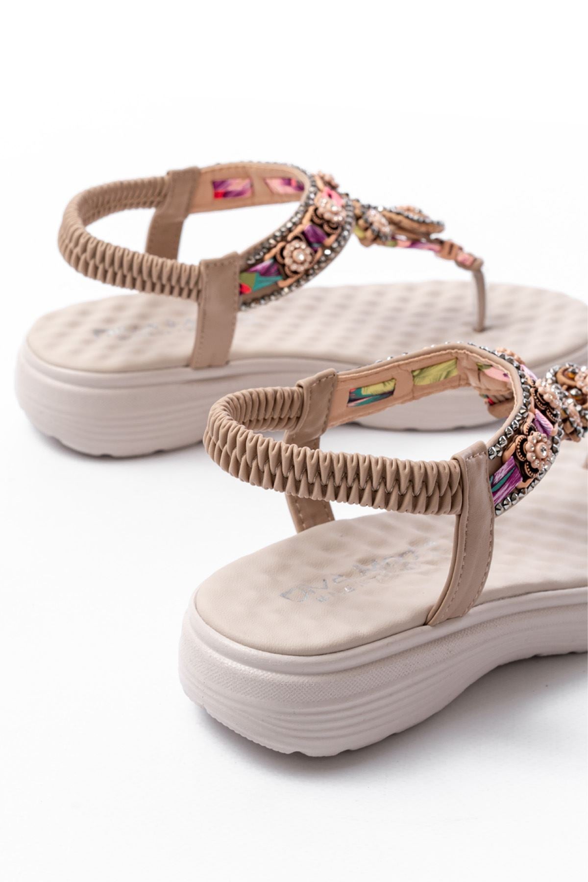 Ayakkabı Aşkı Bej Taşlı Arka Lastikli Parmak Arası Kadın Sandalet