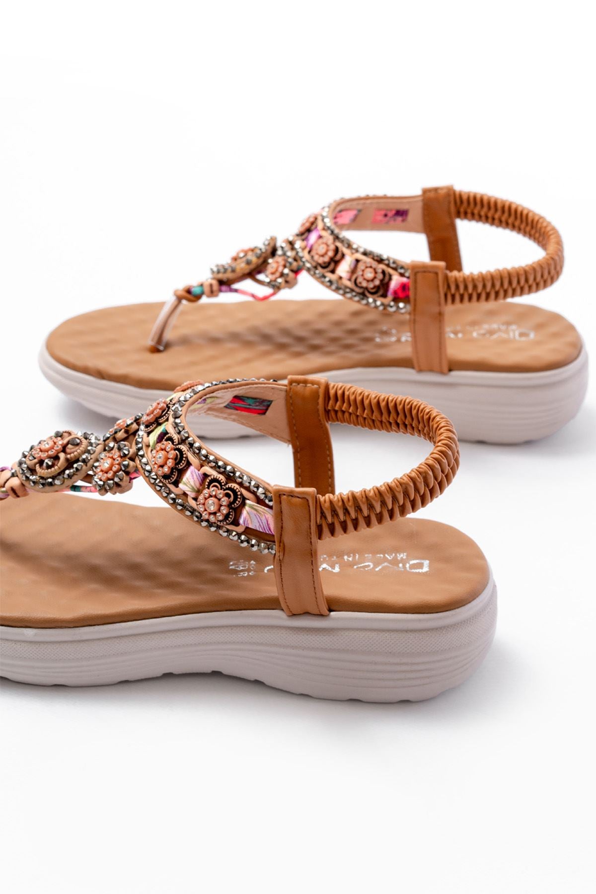 Ayakkabı Aşkı Taba Taşlı Arka Lastikli Parmak Arası Kadın Sandalet