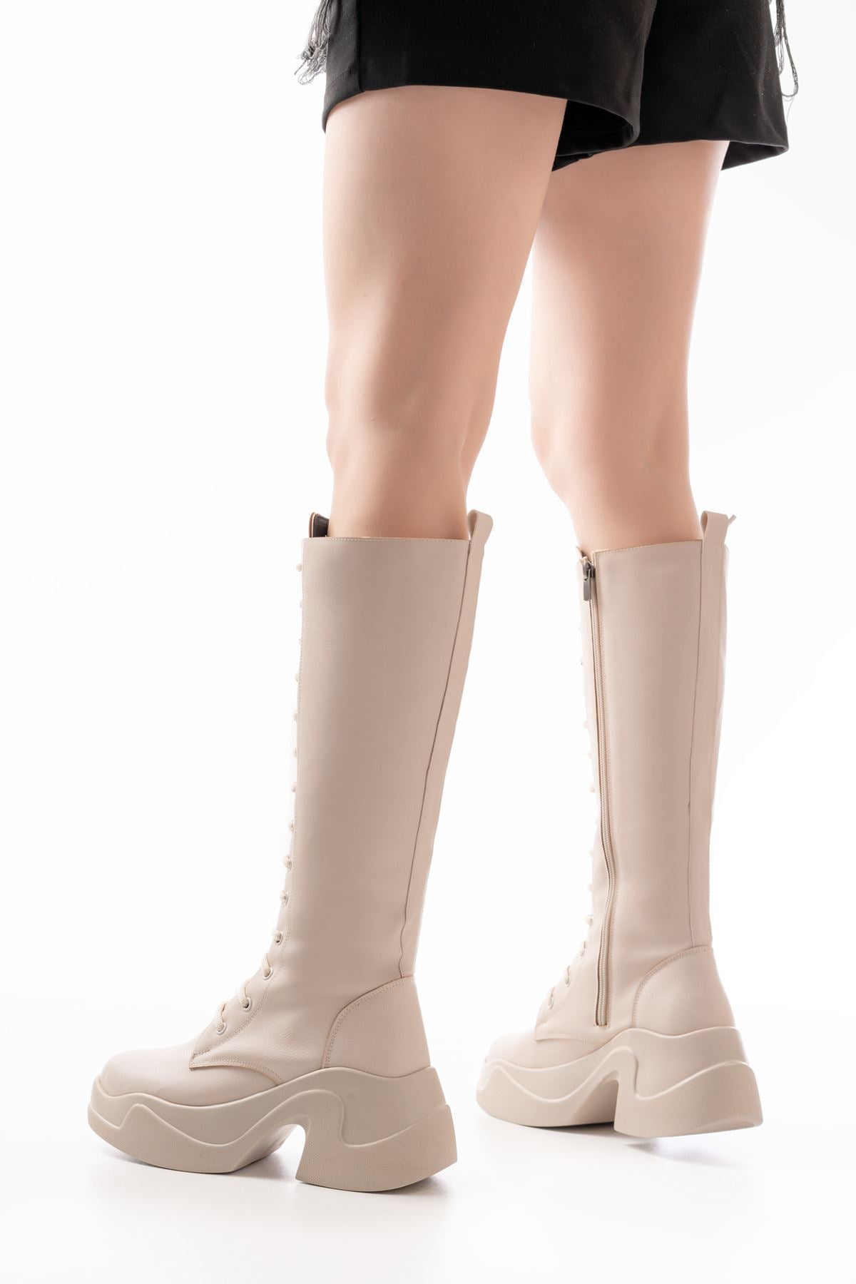Ayakkabı Aşkı Bej Yüksek Tabanlı Bağcıklı Fermuarlı Günlük Kadın Çizme