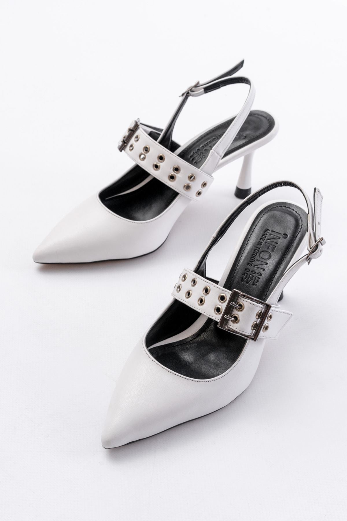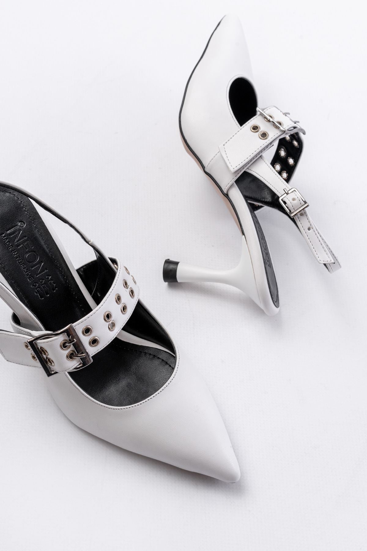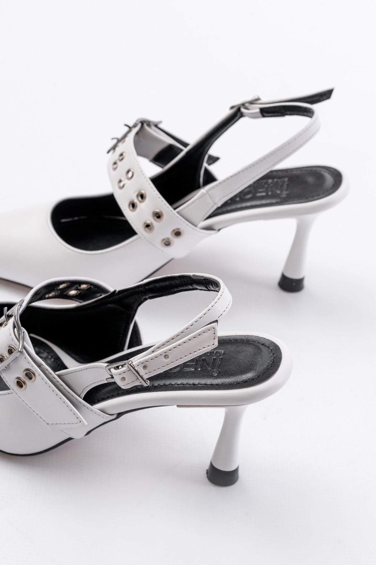 Ayakkabı Aşkı İNF-26 Beyaz Günlük Arkası Açık Baret Tokalı Topuklu Bayan Ayakkabı