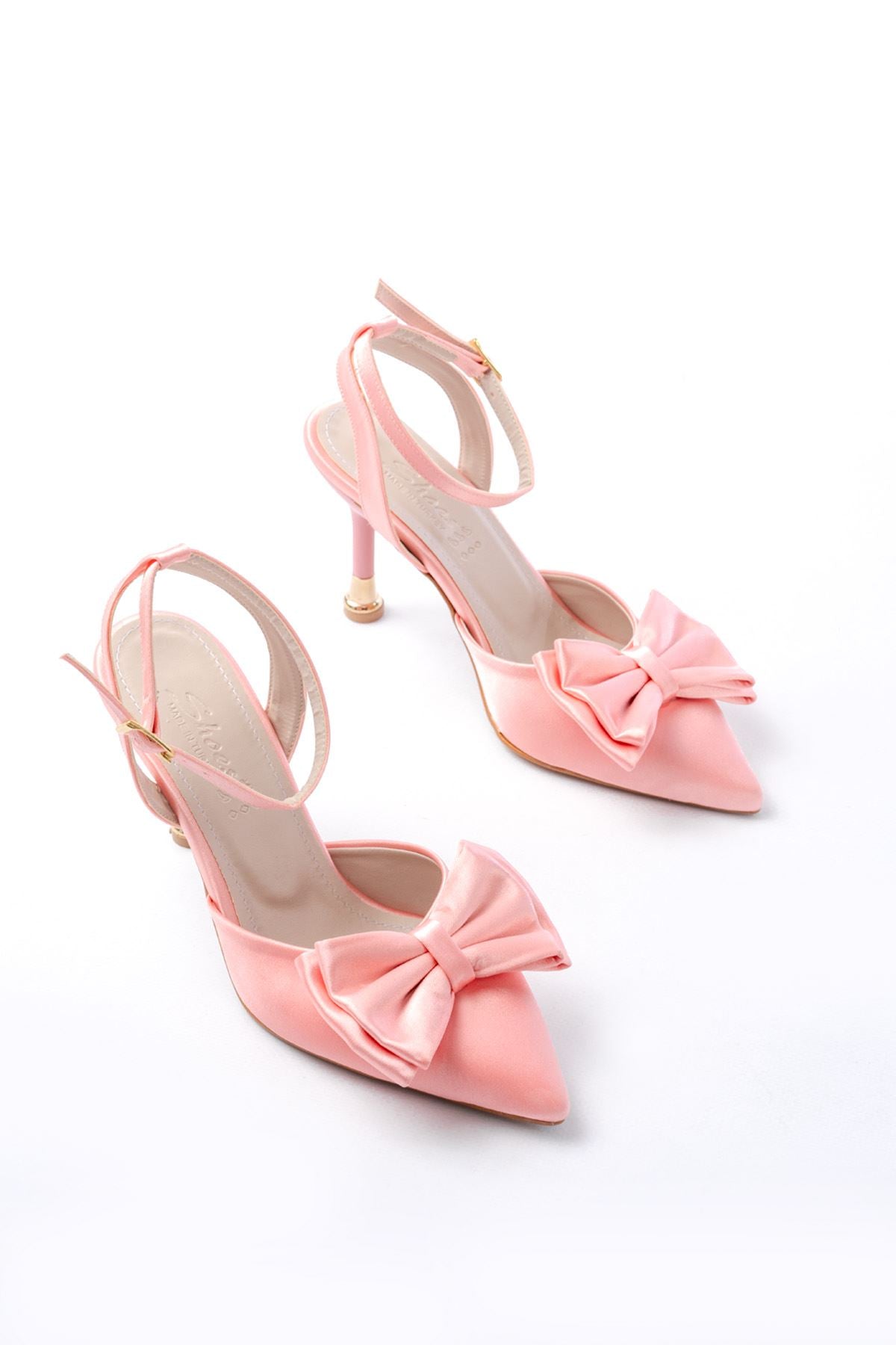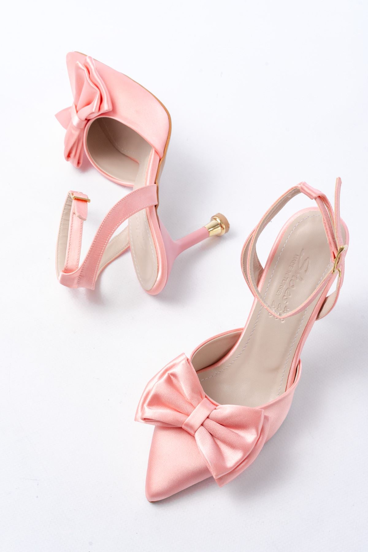 Ayakkabı Aşkı İNF-4505 Pembe Saten Günlük Arkası Açık Kurdele detaylı Topuklu Bayan Ayakkabı