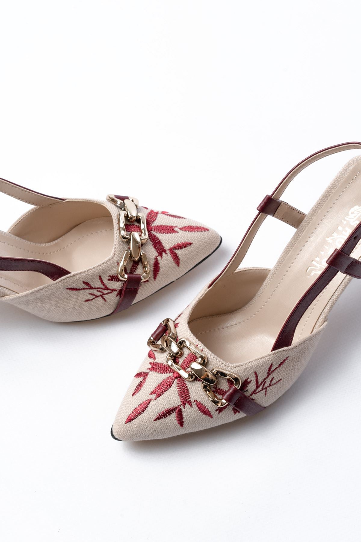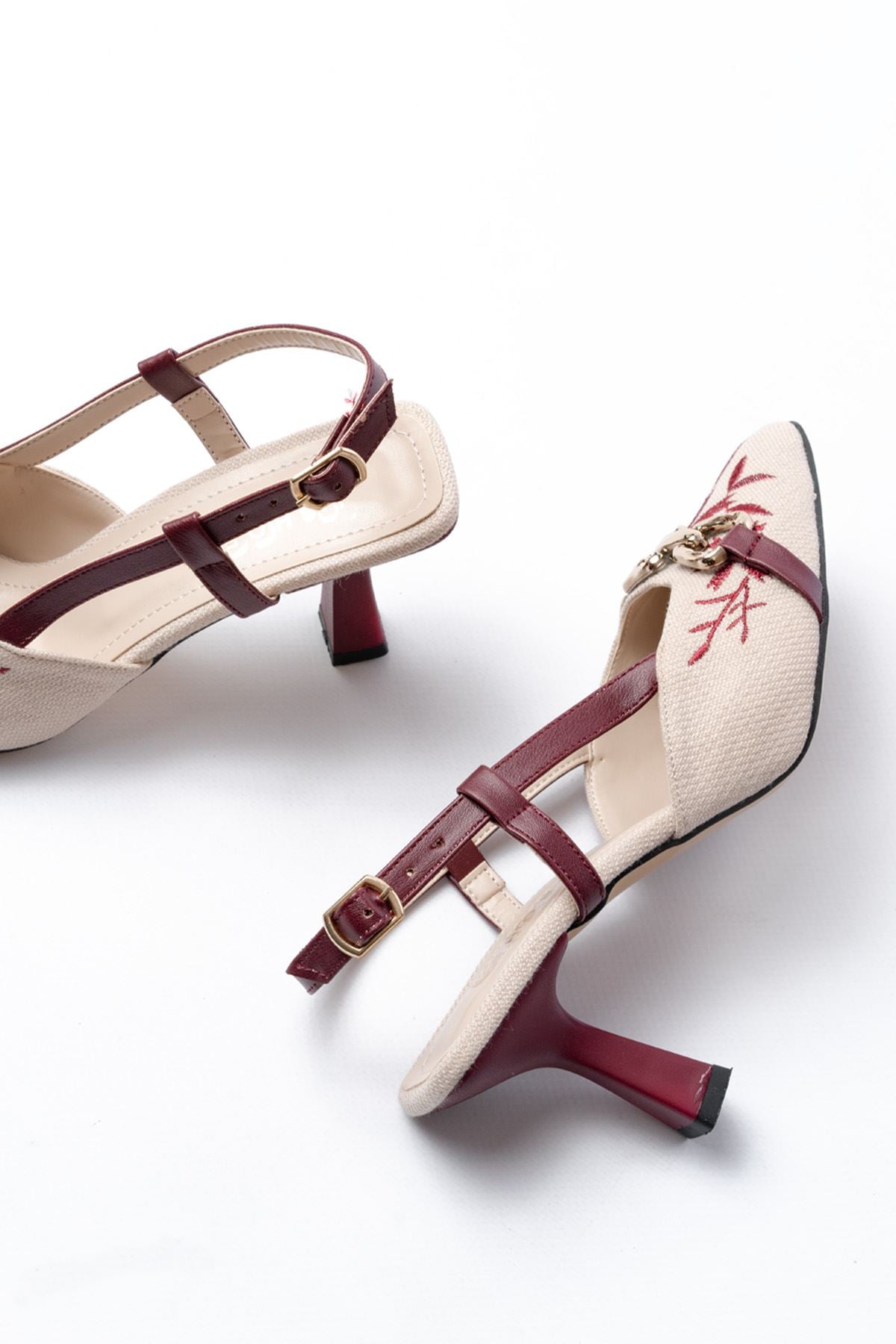 Ayakkabı Aşkı Bordo Keten Günlük Arkası Açık Tokalı Topuklu Kadın Ayakkabı
