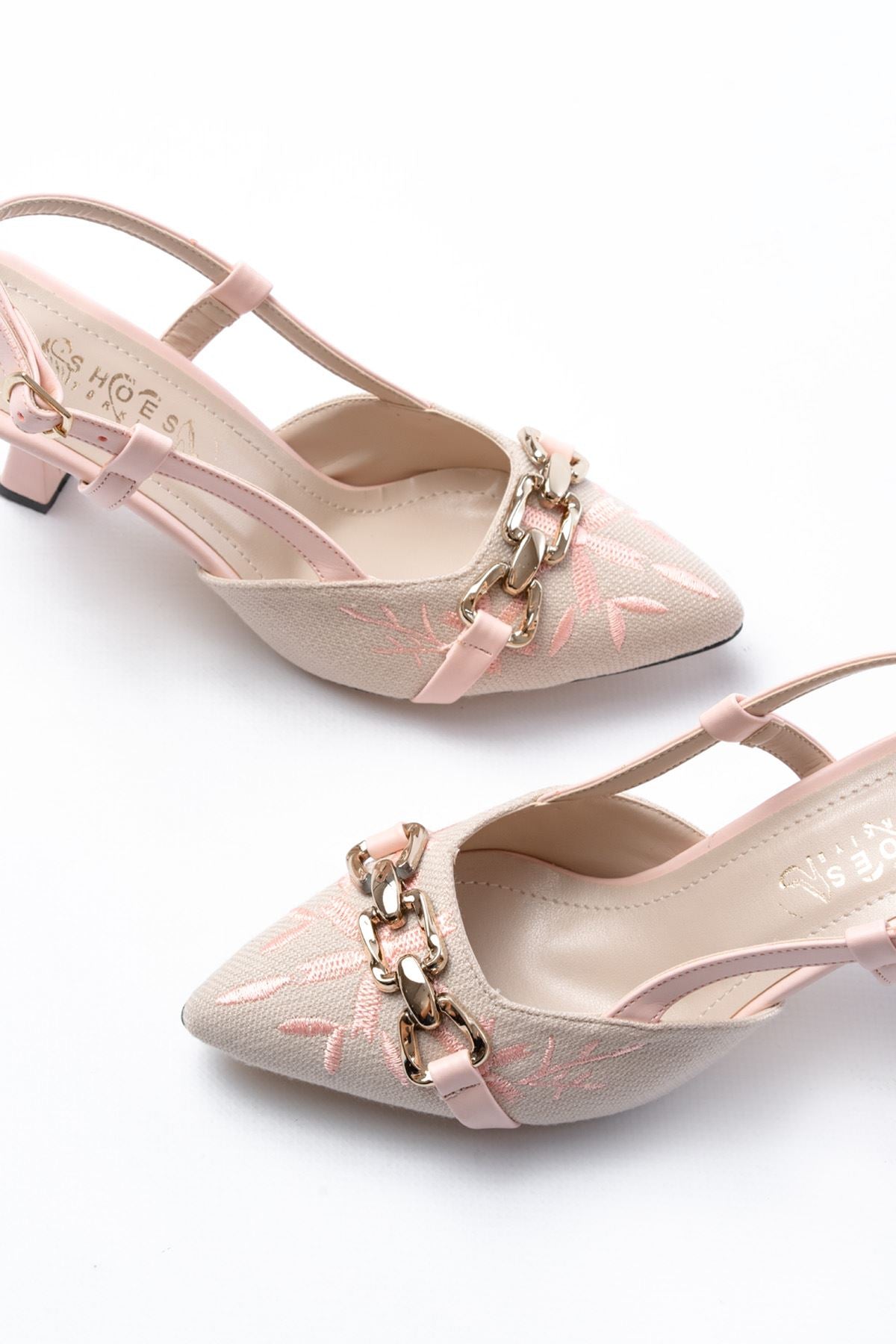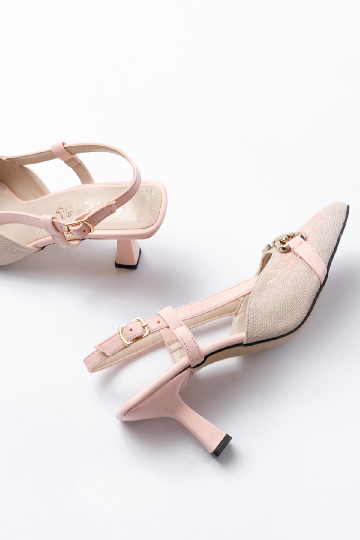 Ayakkabı Aşkı Pudra Keten Günlük Arkası Açık Tokalı Topuklu Kadın Ayakkabı