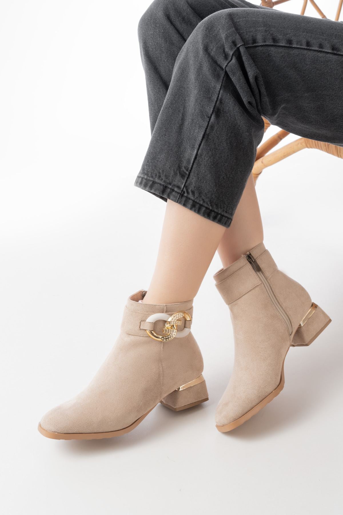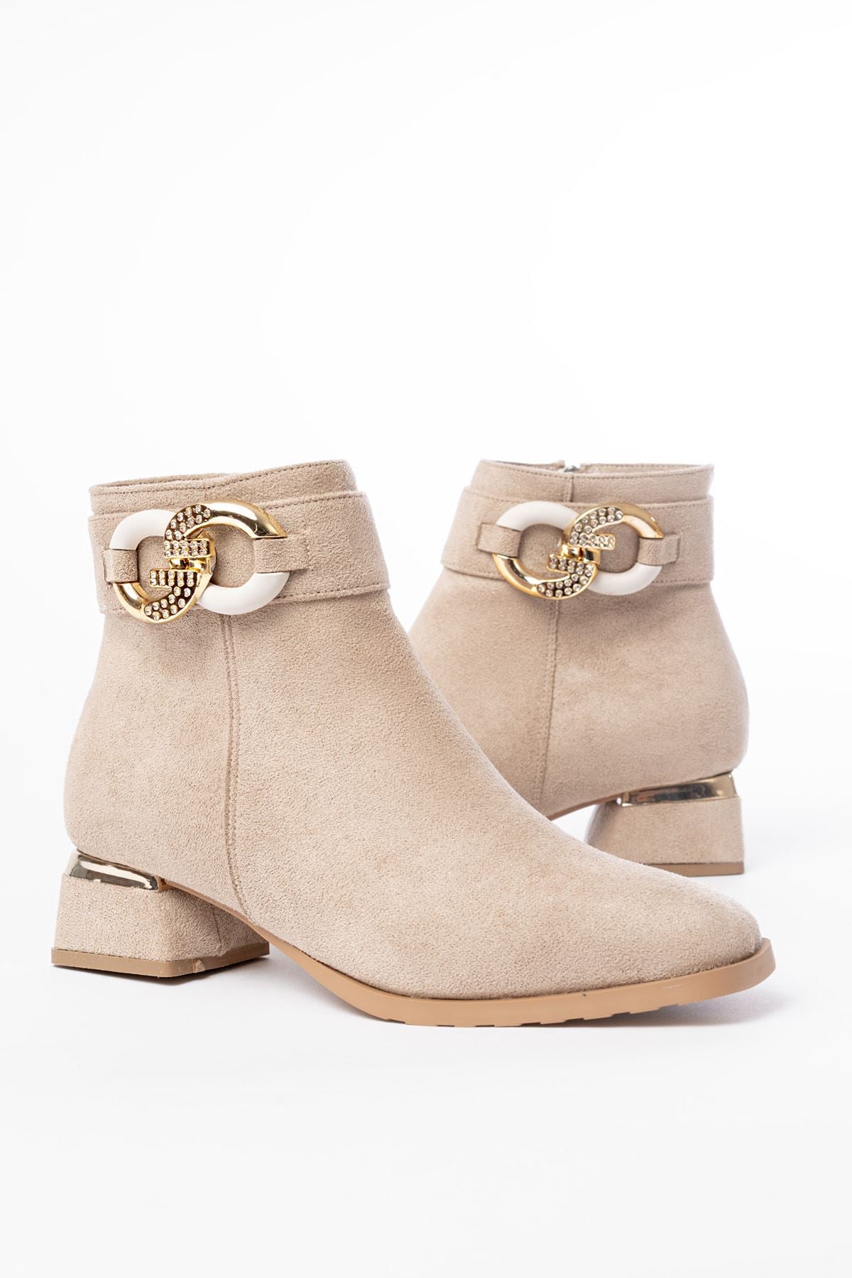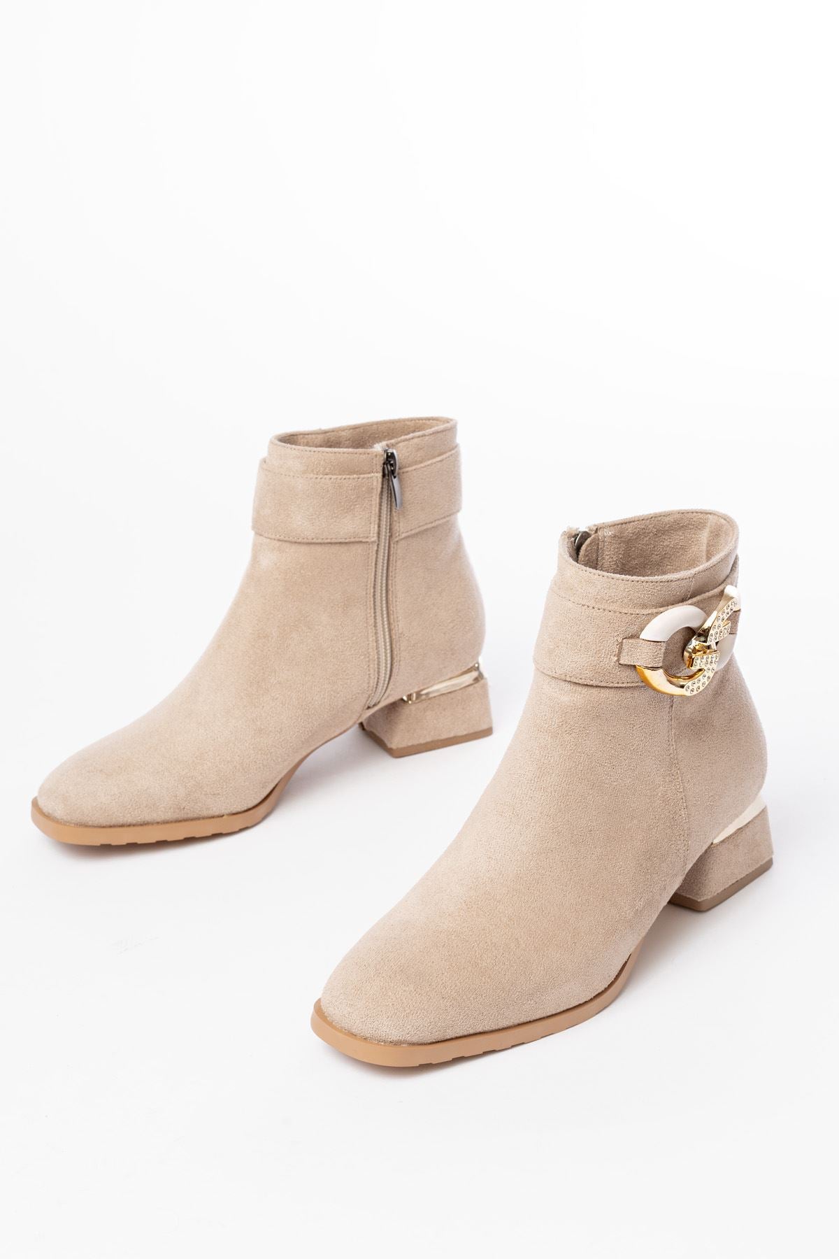 Ayakkabı Aşkı Bej Süet Toka Aksesuarlı Topuklu Fermuarlı Günlük Kadın Bot