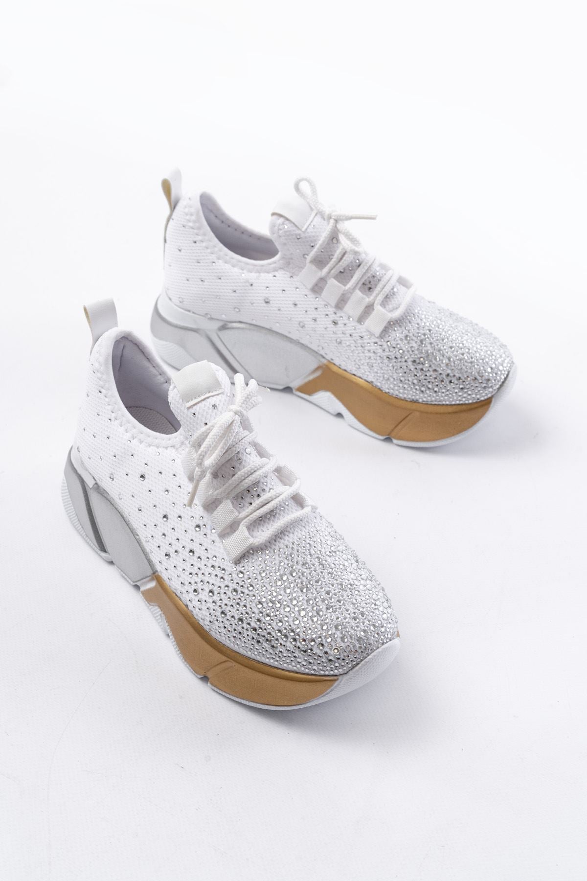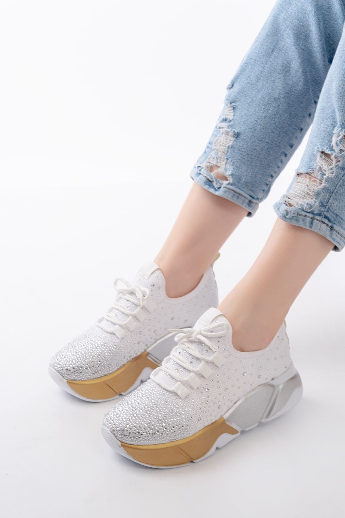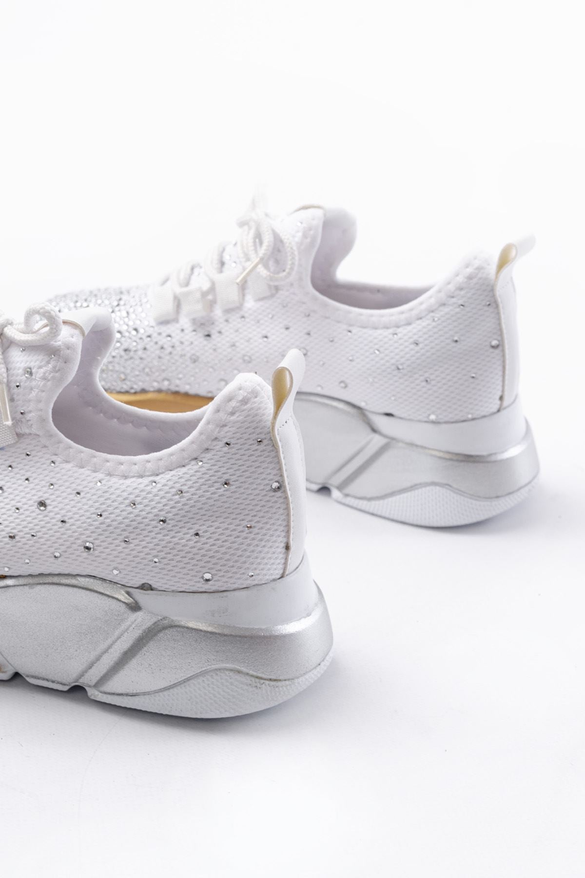 Ayakkabı Aşkı Beyaz Bağcıklı Fileli Gümüş Taşlı Günlük Kadın Spor