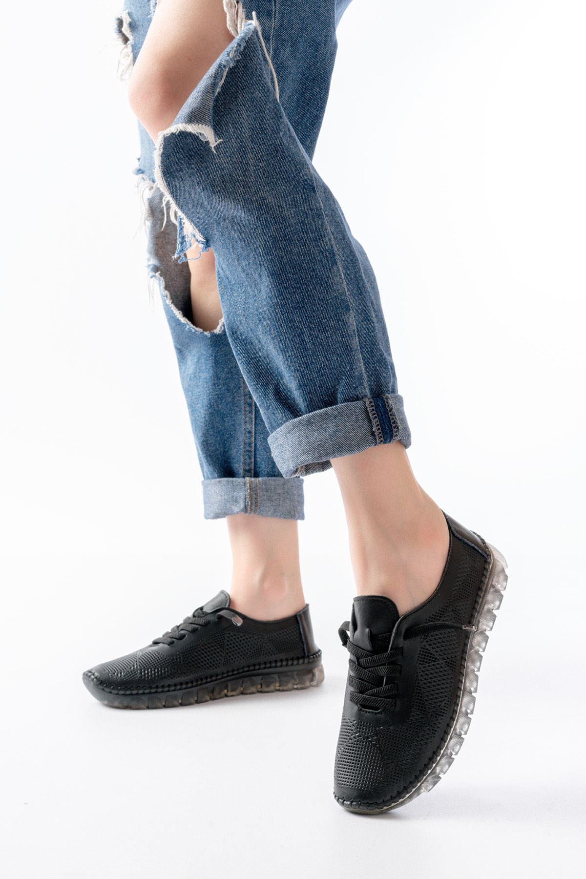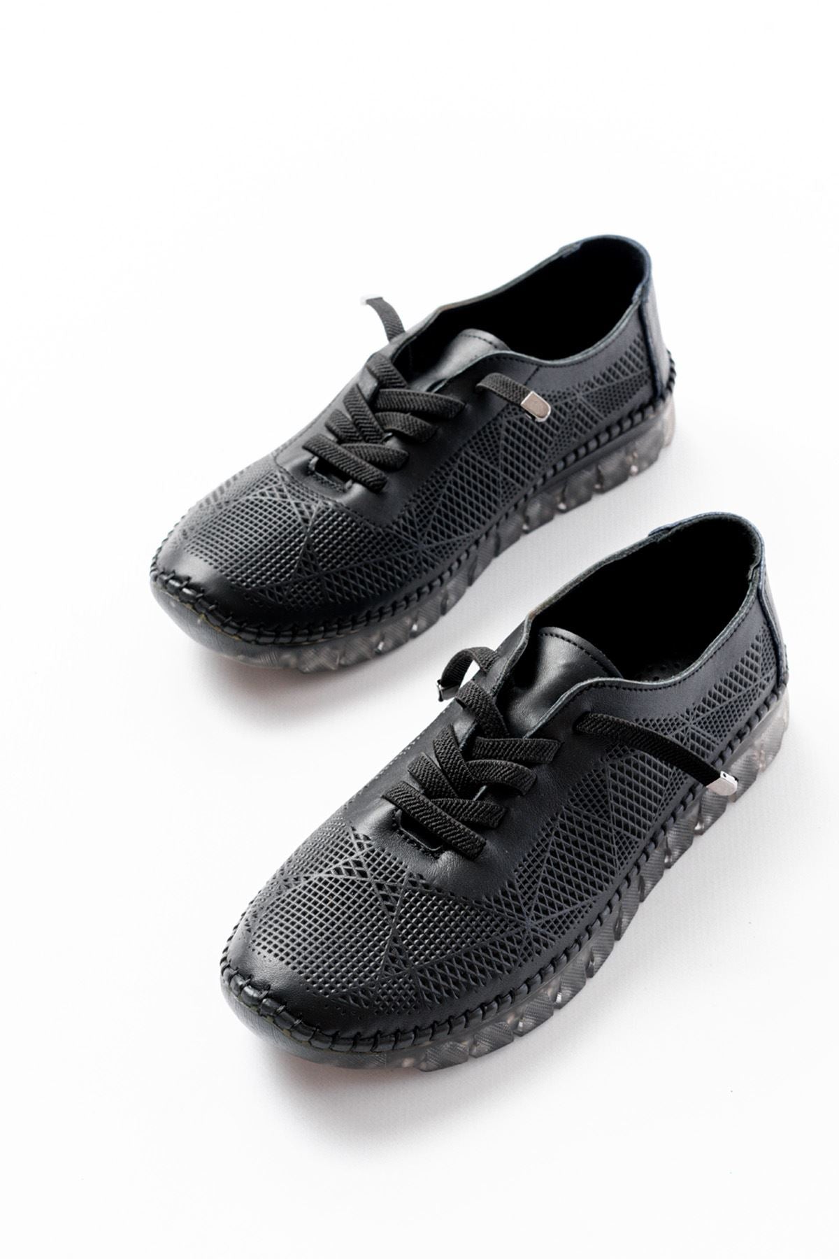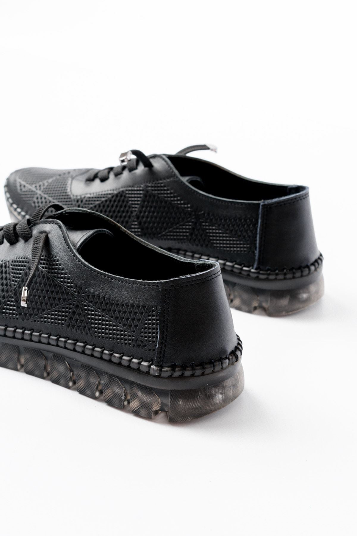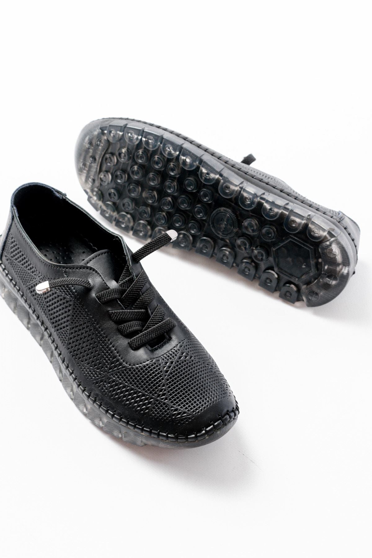 Ayakkabı Aşkı Siyah Desenli Hakiki Deri Şeffaf Taban Kadın Spor Ayakkabı