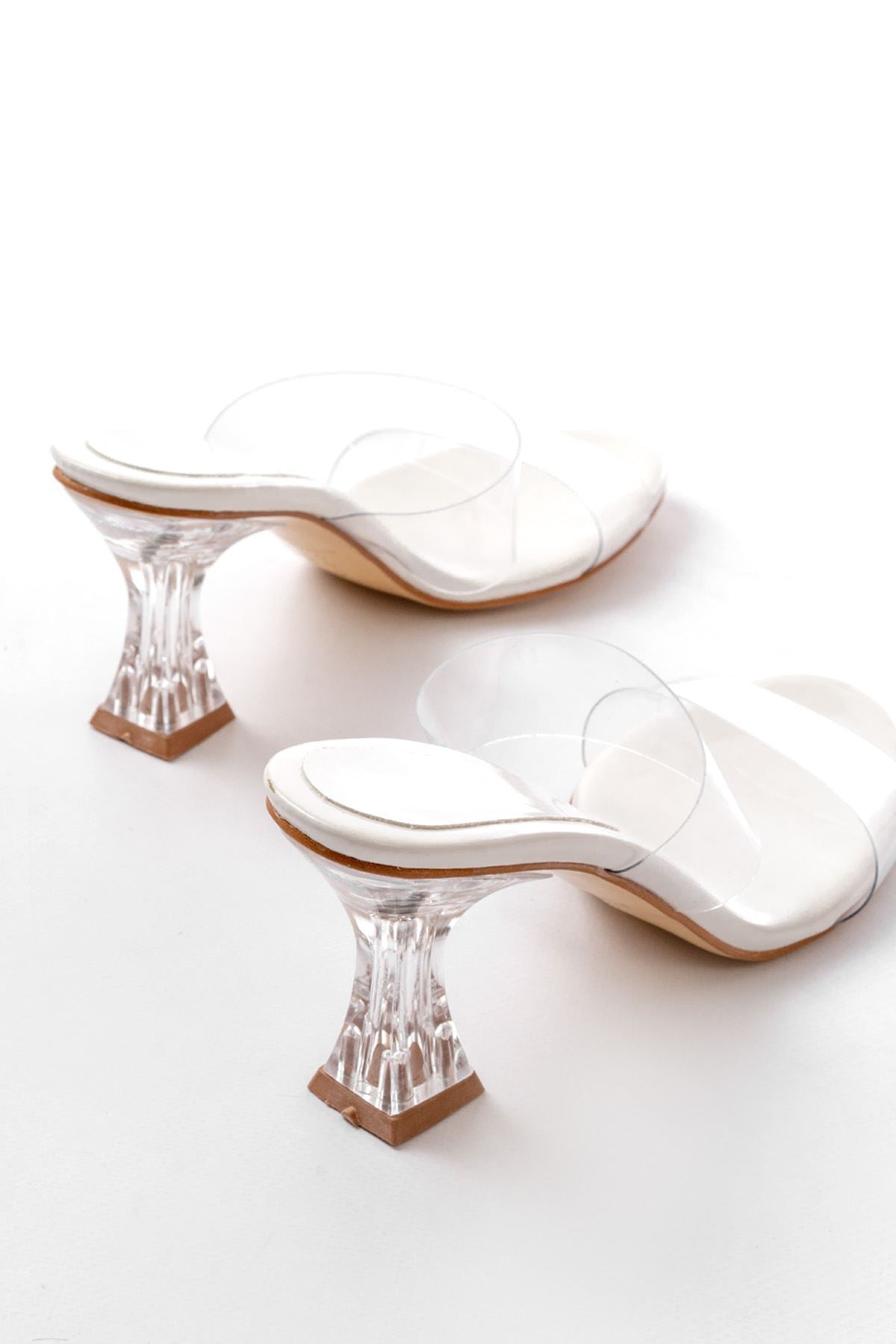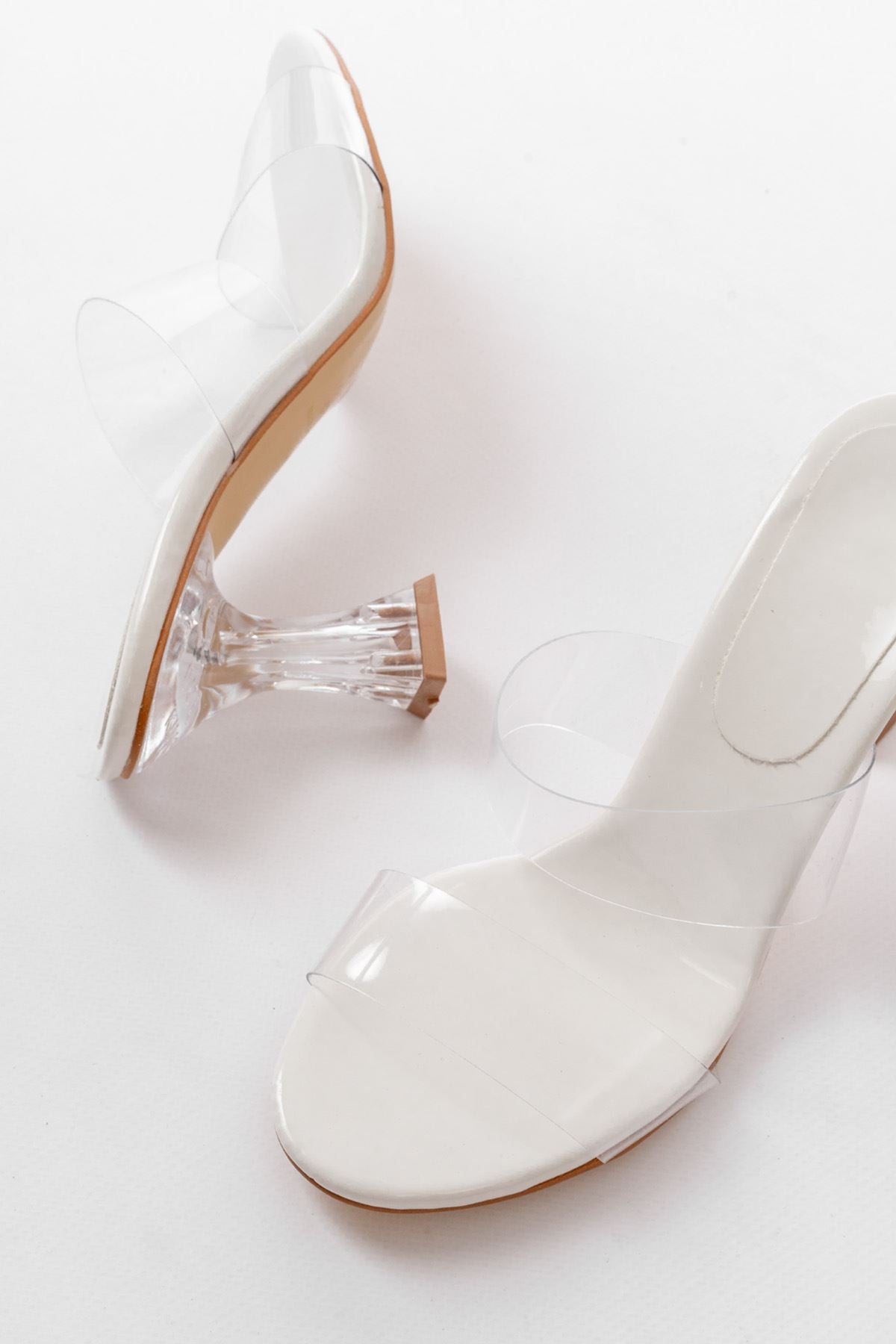 Ayakkabı Aşkı Beyaz Rugan Çift Bantlı Topuklu Kadın Terlik