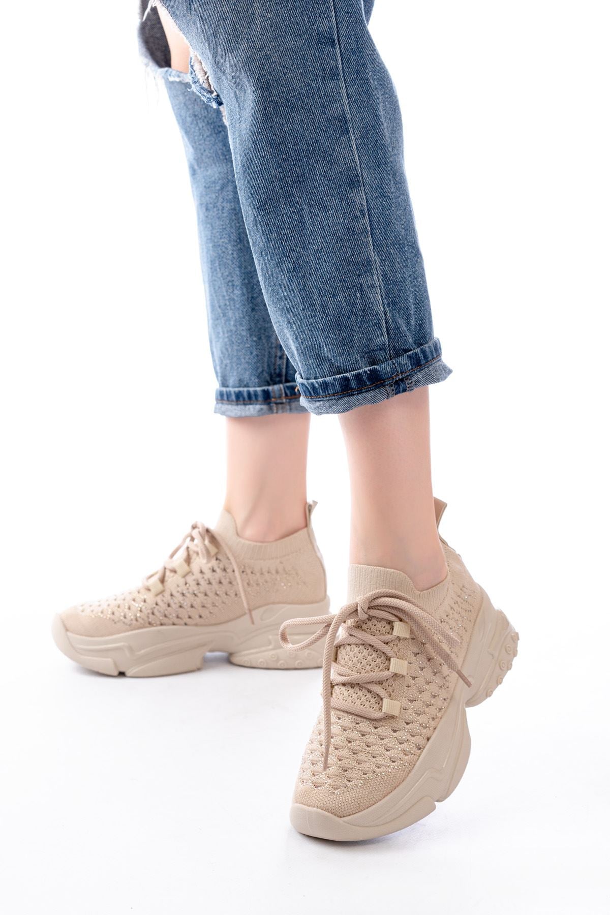 Ayakkabı Aşkı Bej Günlük Bağcıklı Fileli Taş Aksesuarlı Kadın Spor Ayakkabı