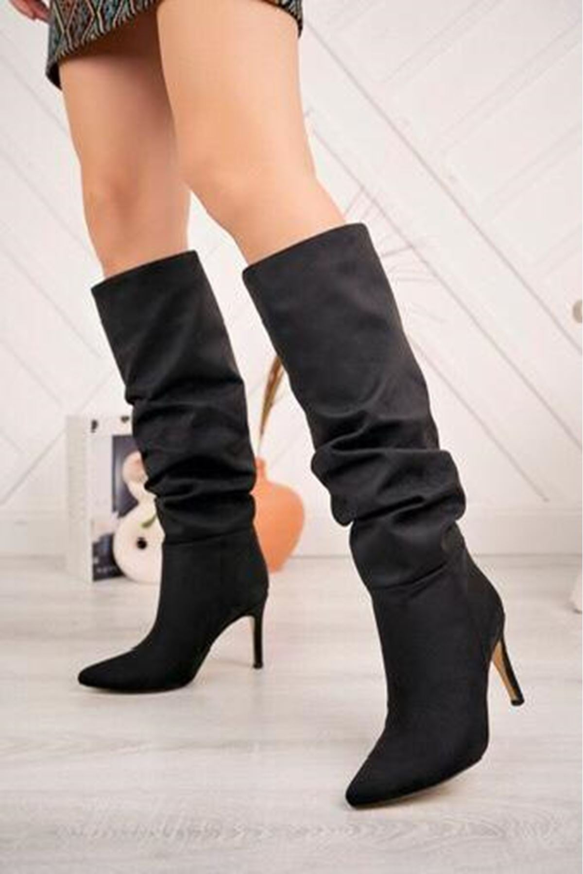 Ayakkabı Aşkı Siyah Süet Körüklü İnce Topuklu Günlük Bayan Çizme