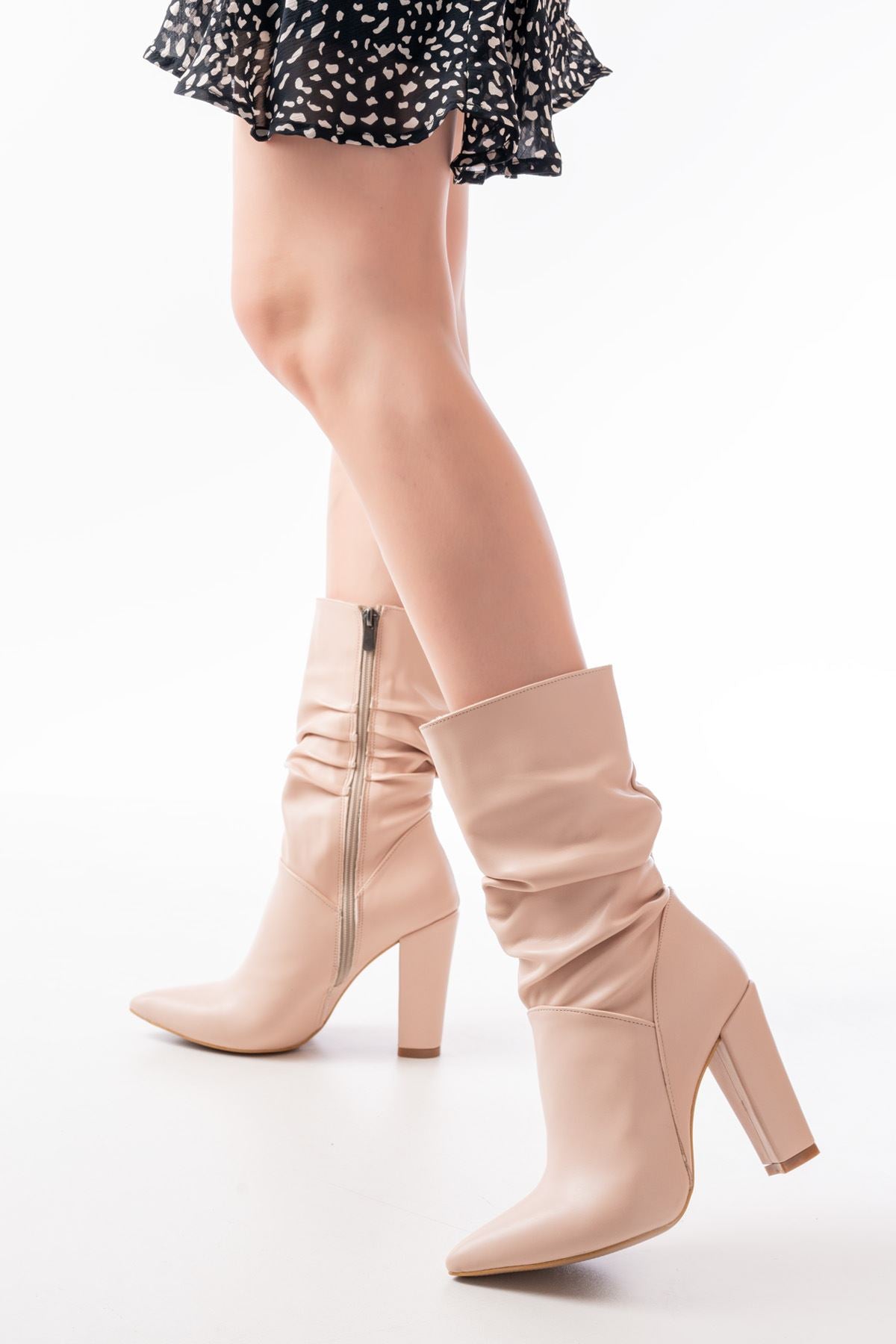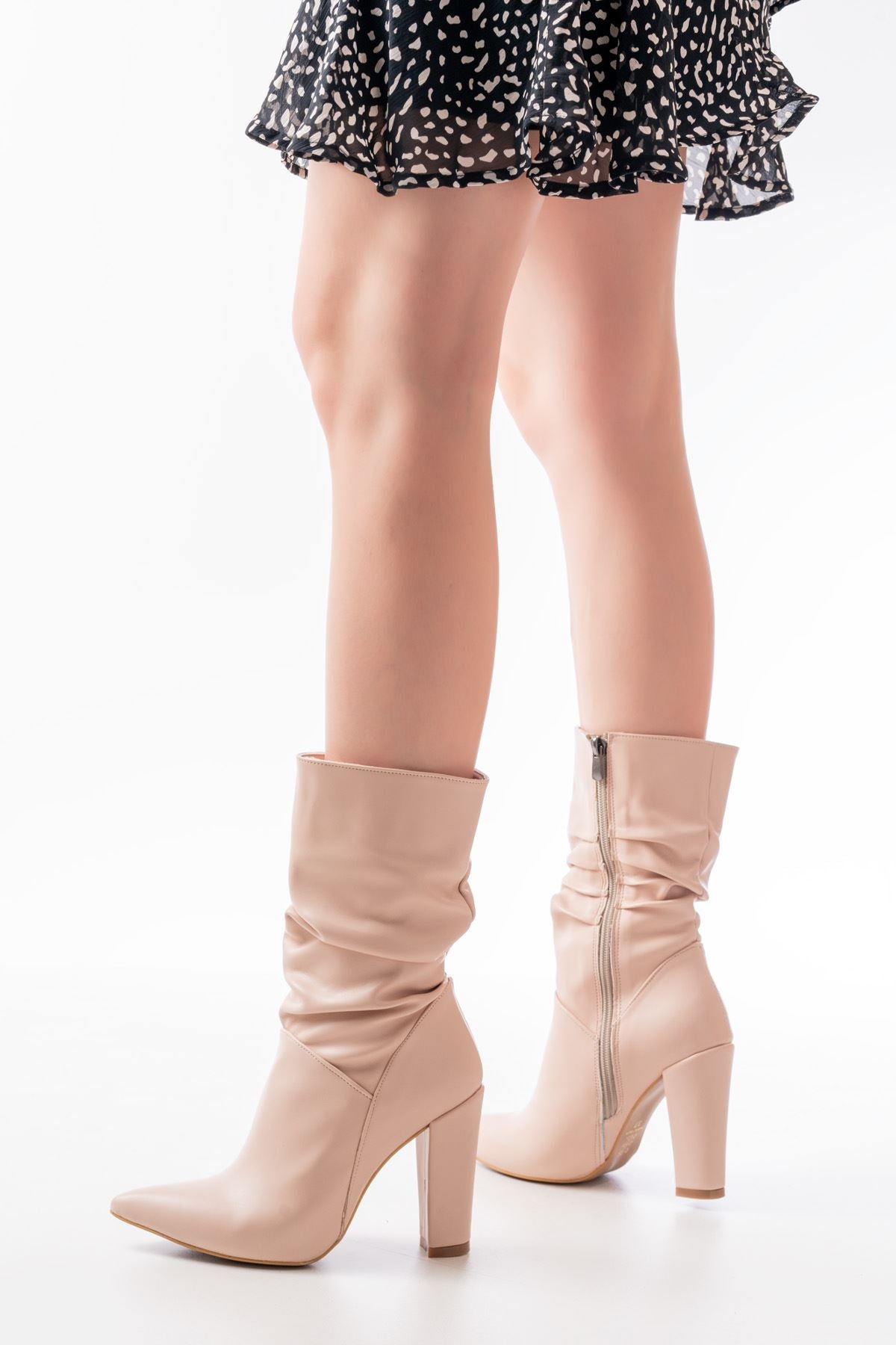 Ayakkabı Aşkı Bej Yüksek Kalın Topuklu Körüklü Fermuarlı Kadın Bot