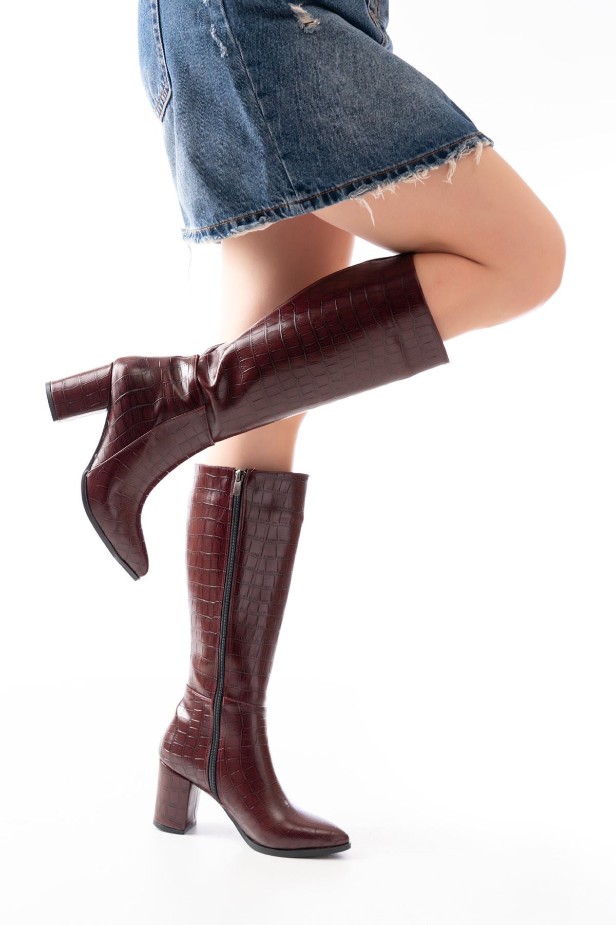 Ayakkabı Aşkı Bordo Kroko Topuklu Kadın Çizme